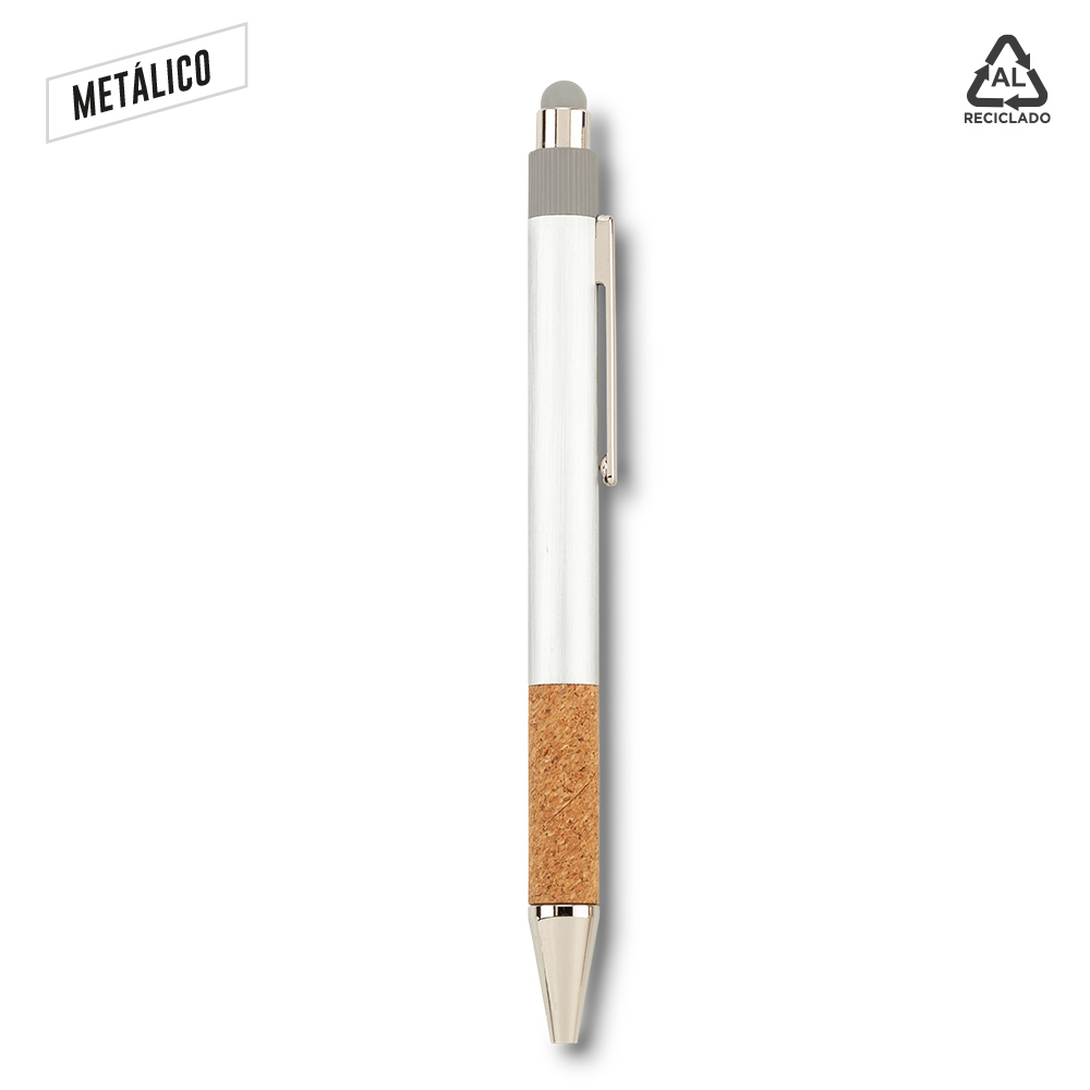 Bolígrafo en aluminio reciclado. Con grip en corcho. Mecanismo push. Medidas: 14 cm Marca: 4 cm / Tampografía Venta mínima y en múltiplos de caja de 50 unidades.