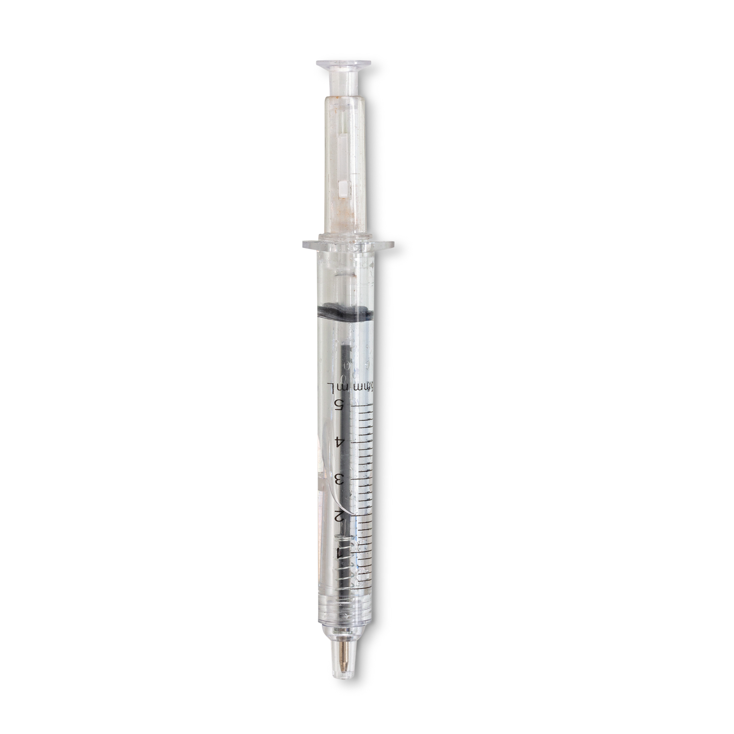 Bolígrafo plástico tipo jeringa. La tinta es de color negro.