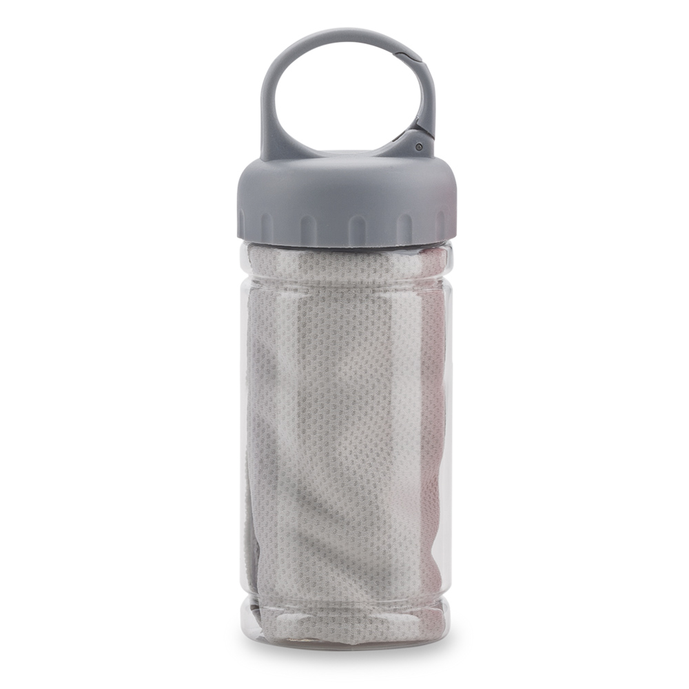 Toalla poliester con tejido especial que al humedecerse bloquea el agua manteniendo la temperatura de 3 a 4 horas Su estructura permite que el agua reduzca la sensacion de calor Empaque tarro PVC