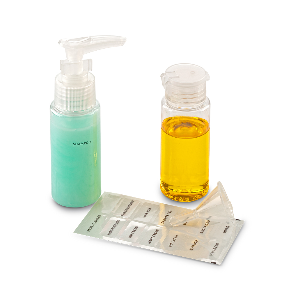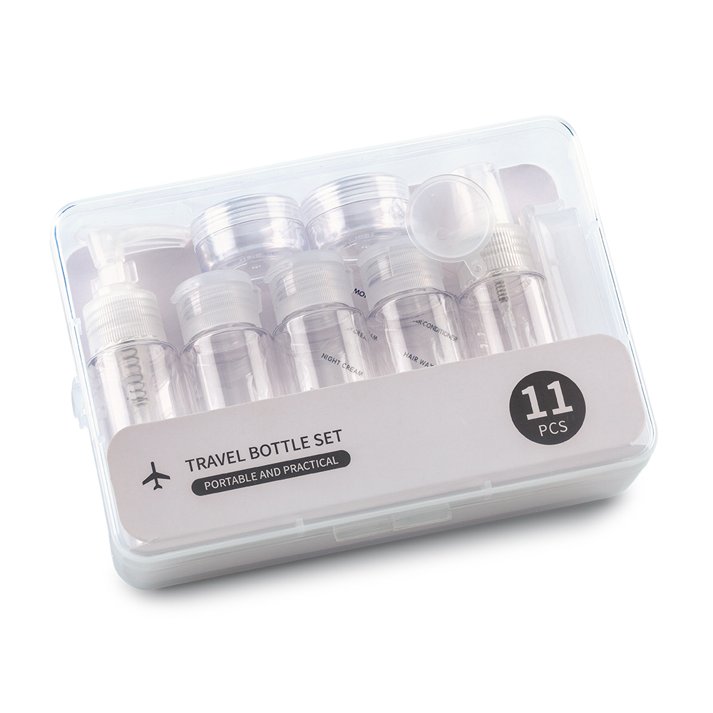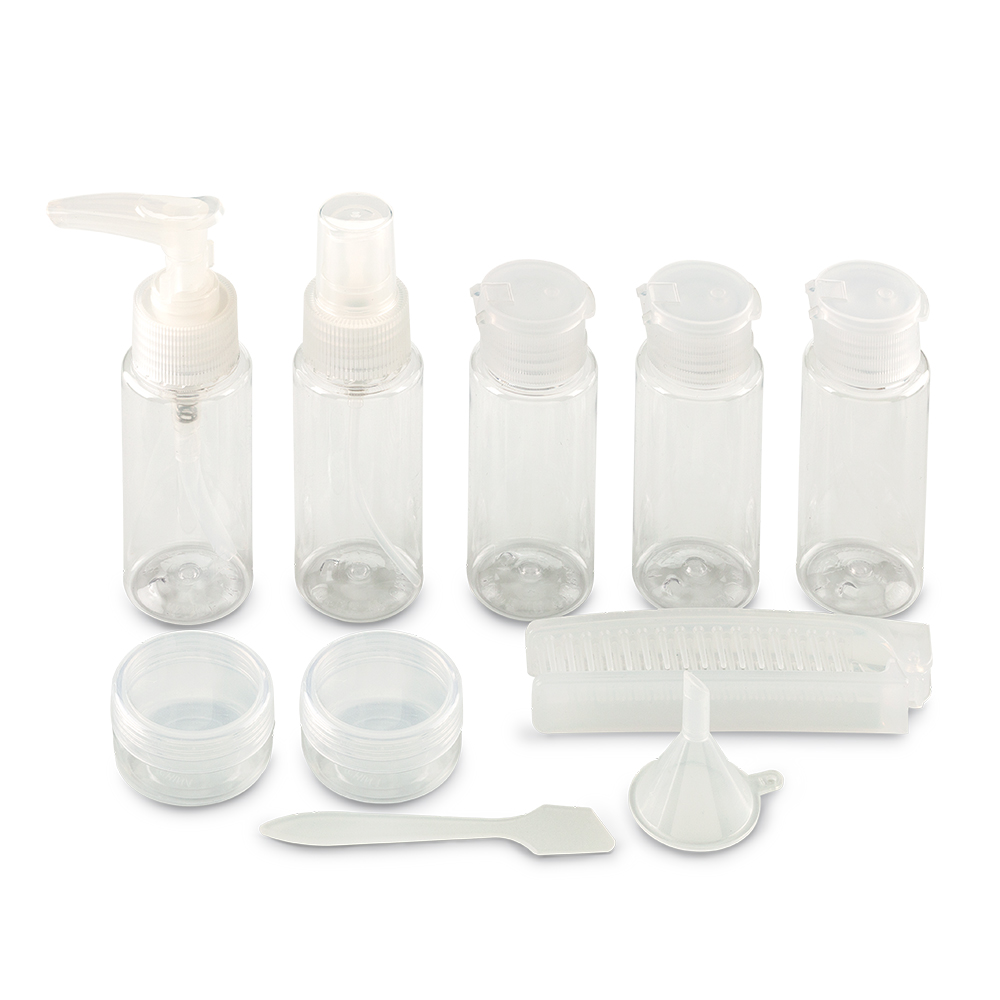 Set de 11 piezas plasticas para viaje: 3 frascos con tapa abatible (500 ml) 1 frasco dosificador (50 ml) 1 frasco tapa spray (50 ml) 2 tarros de crema (10 ml) 1 peine 1 embudo 1 espatula identificadores adhesivos