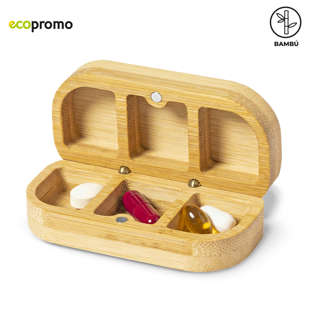 Pastillero en bambú.3 divisiones internas. Empaque bolsa Individual