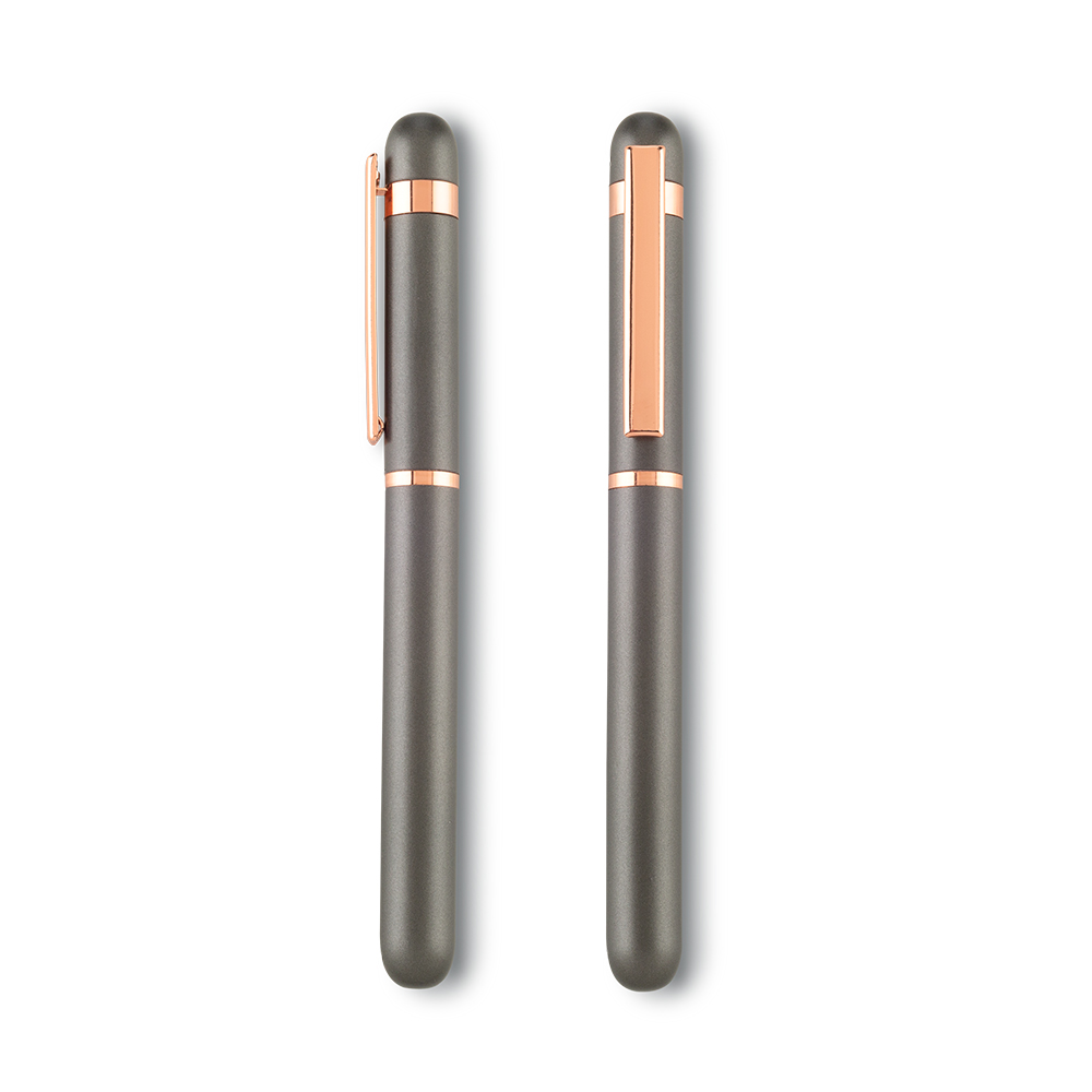 Bolígrafo metálico tipo roller. Empaque caja individual.