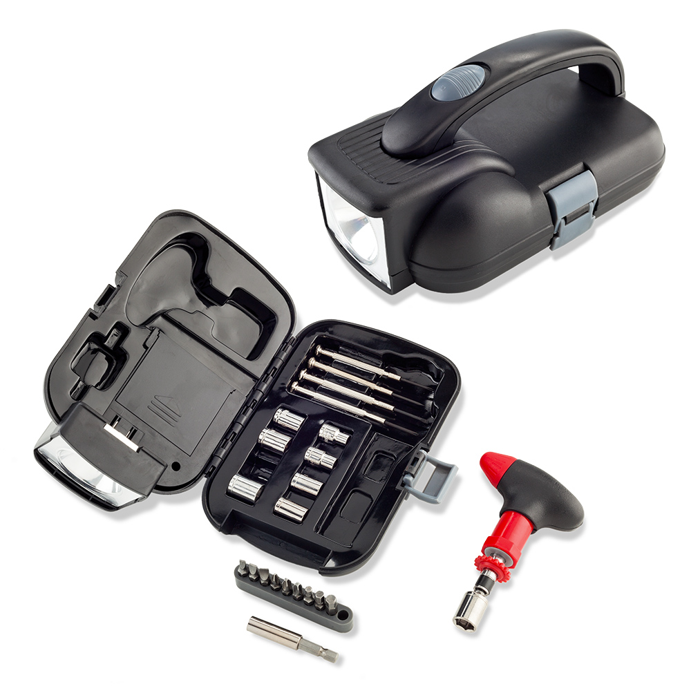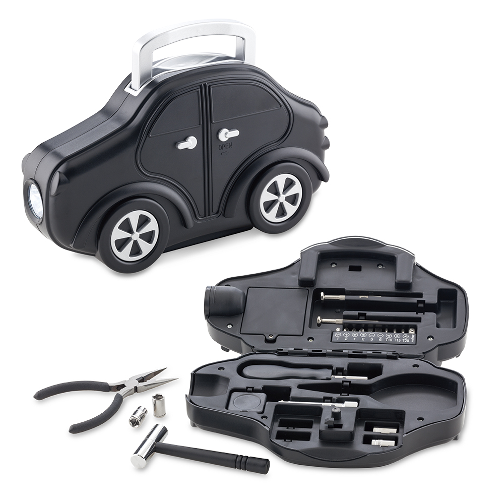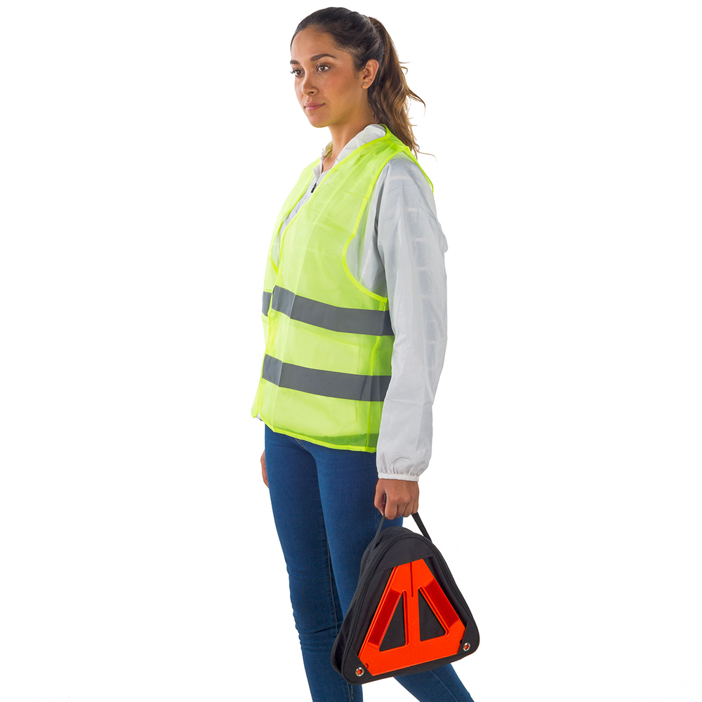 Incluye guantes pinzas chaleco de seguridad linterna destornillador medidor de presion para llantas triangulo reflectivo y cables de emergencia Estuche en poliester