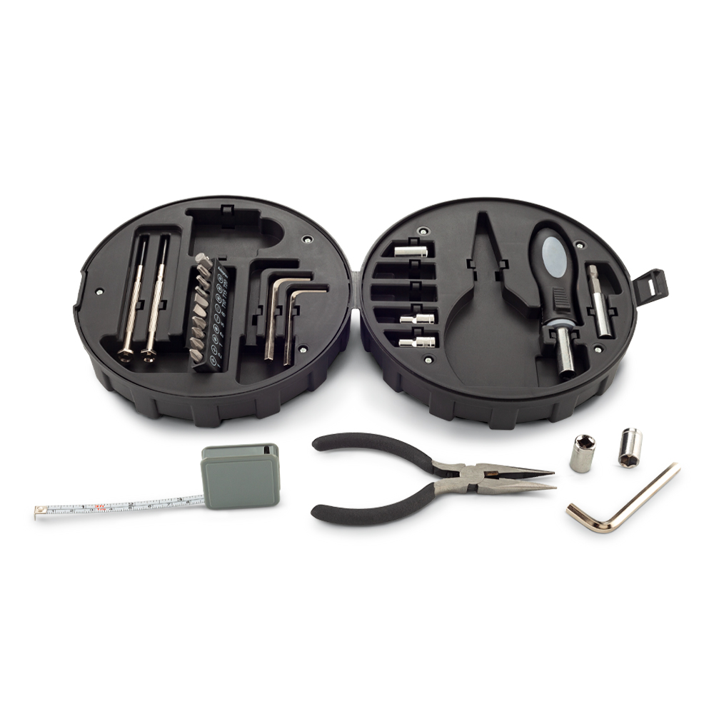 Set de herramientas de 24 piezas en estuche plástico. Cierre a presión. Empaque caja individual.