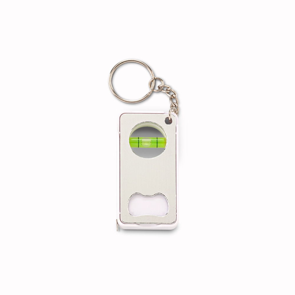 Llavero plástico con metro de 1mt con nivelador y destapador metálico.