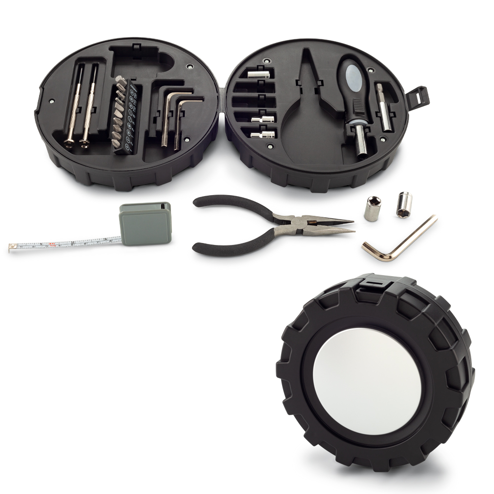 Set de herramientas de 24 piezas en estuche plástico y bambú. Cierre a presión. Empaque caja individual.
