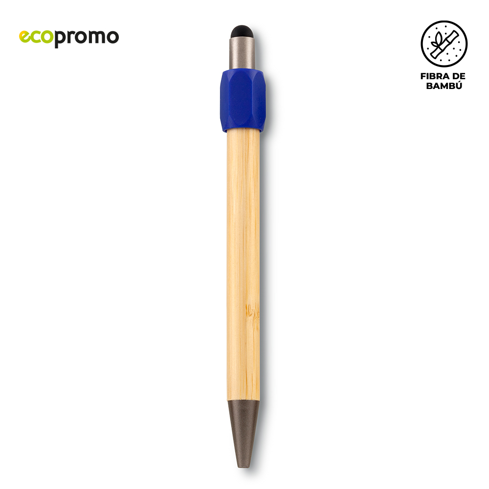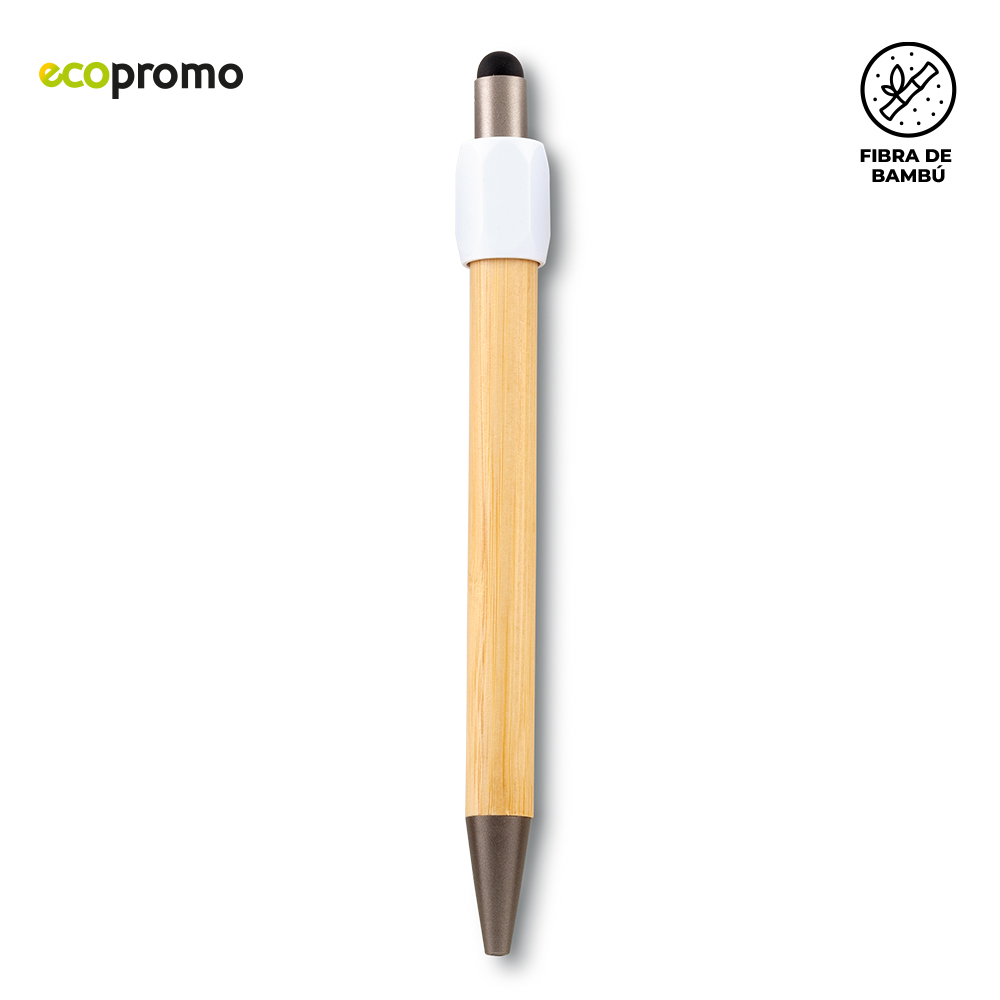 Bolígrafo en bambú con mecanismo push y stylus. Incluye un antiestresante giratorio.
