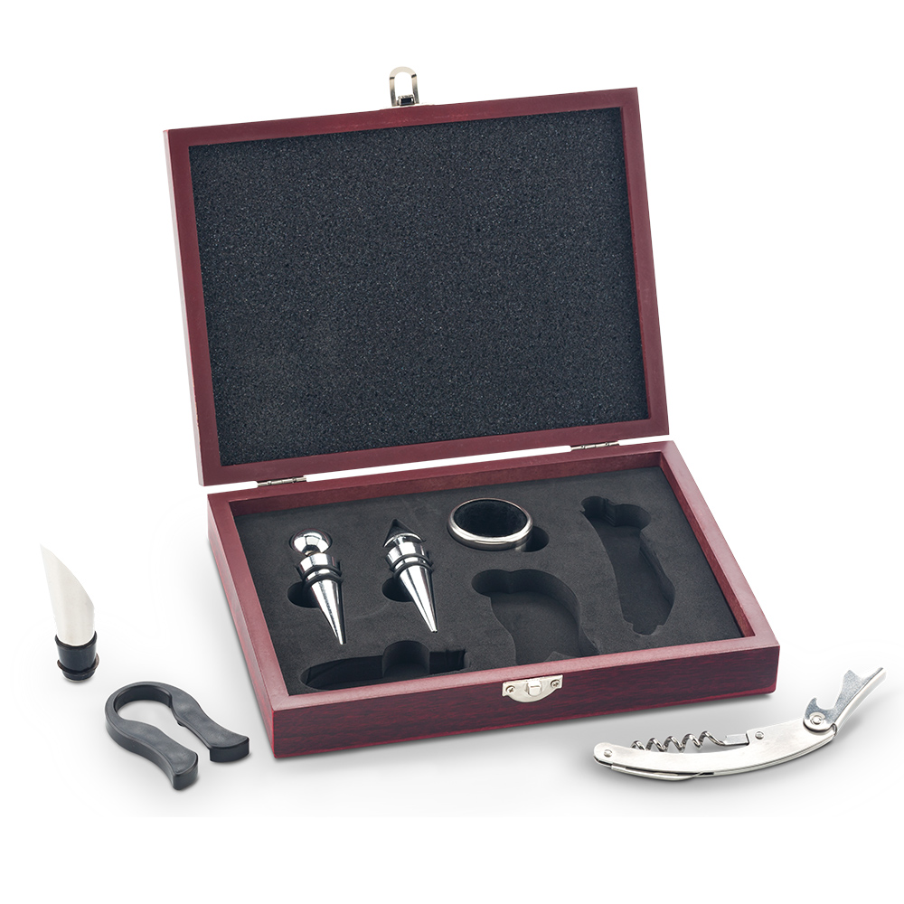 Set de vino en madera: 2 corchos dosificador cortador destapador y argolla antigoteo Empaque Caja Individual
