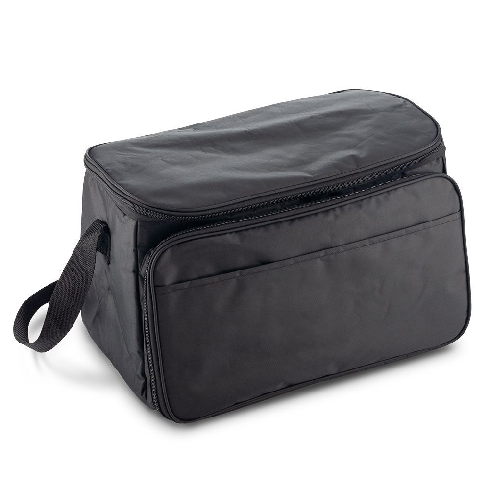 Nevera en lona poliester con bolsillo frontal de cremallera y set de BBQ con 3 utensilios metalicos (pinzas trinche espatula)