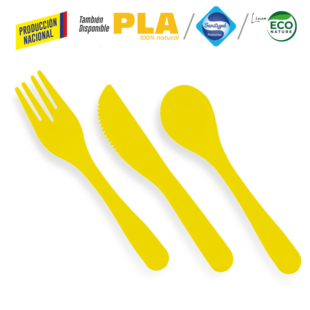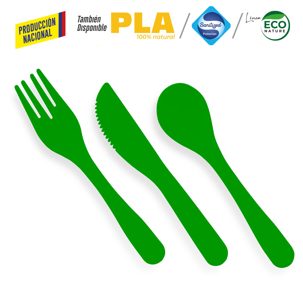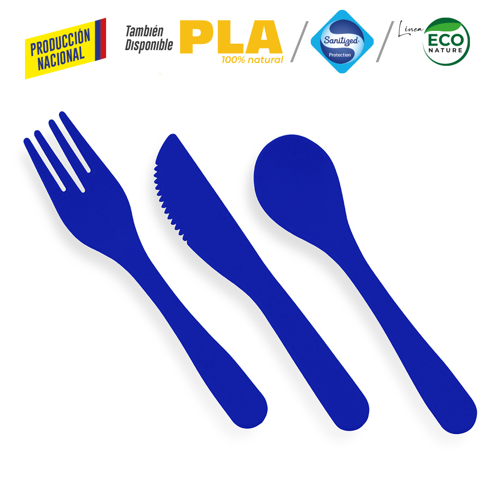 En plastico incluye cuchara tenedor y cuchillo Se vende por set Opcional solo polipropileno o con material ecologico de fibra de trigo Mezcla con material ecologico en fibra de trigo (50%-60% aprox) El porcentaje de material ecologico tiene un promedio de biodegradabilidad de 2-3 anos despues del fin de su vida util