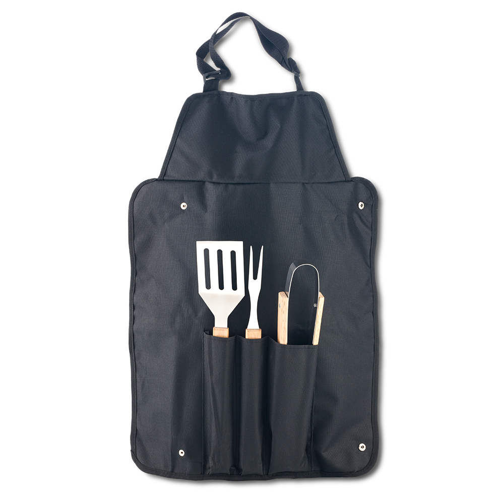 Set de BBQ con 3 utensilios metalicos (pinzas trinche espatula) Estuche delantal en lona