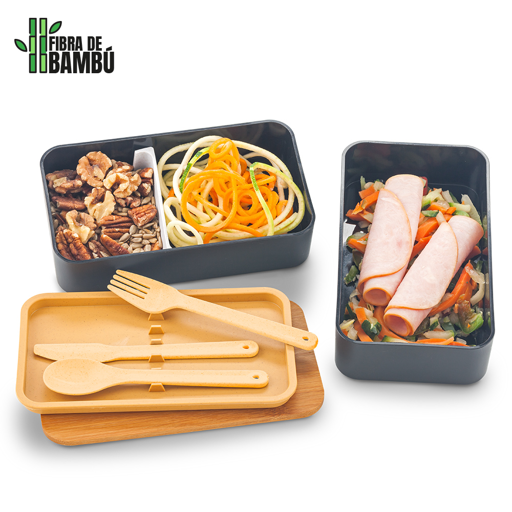Portacomidas plastico de 2 compartimentos de 700ml de capacidad cada uno Elaborado en plastico con fibra de bambu Incluye set de cubiertos y elastico Apto para maquina lava vajillas y microondas (max 3 minutos sin tapa ni cubiertos)