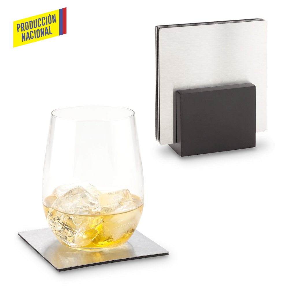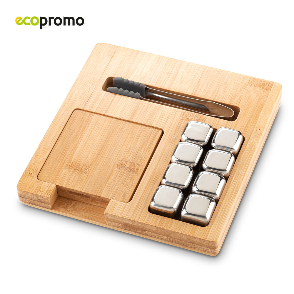 Set de bar en bambu con 2 portavasos en bambu 8 cubos de hielo en acero inoxidable una pinza en acero inoxidable Empaque caja Individual
