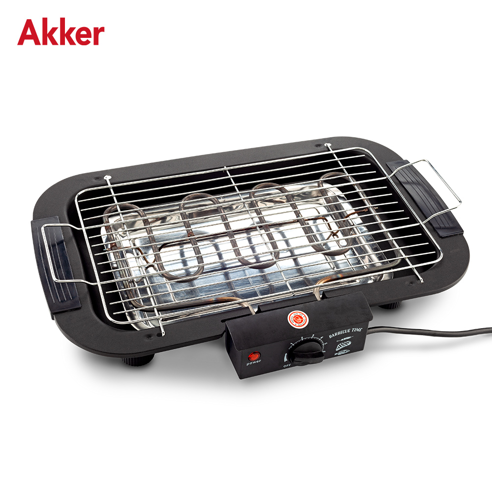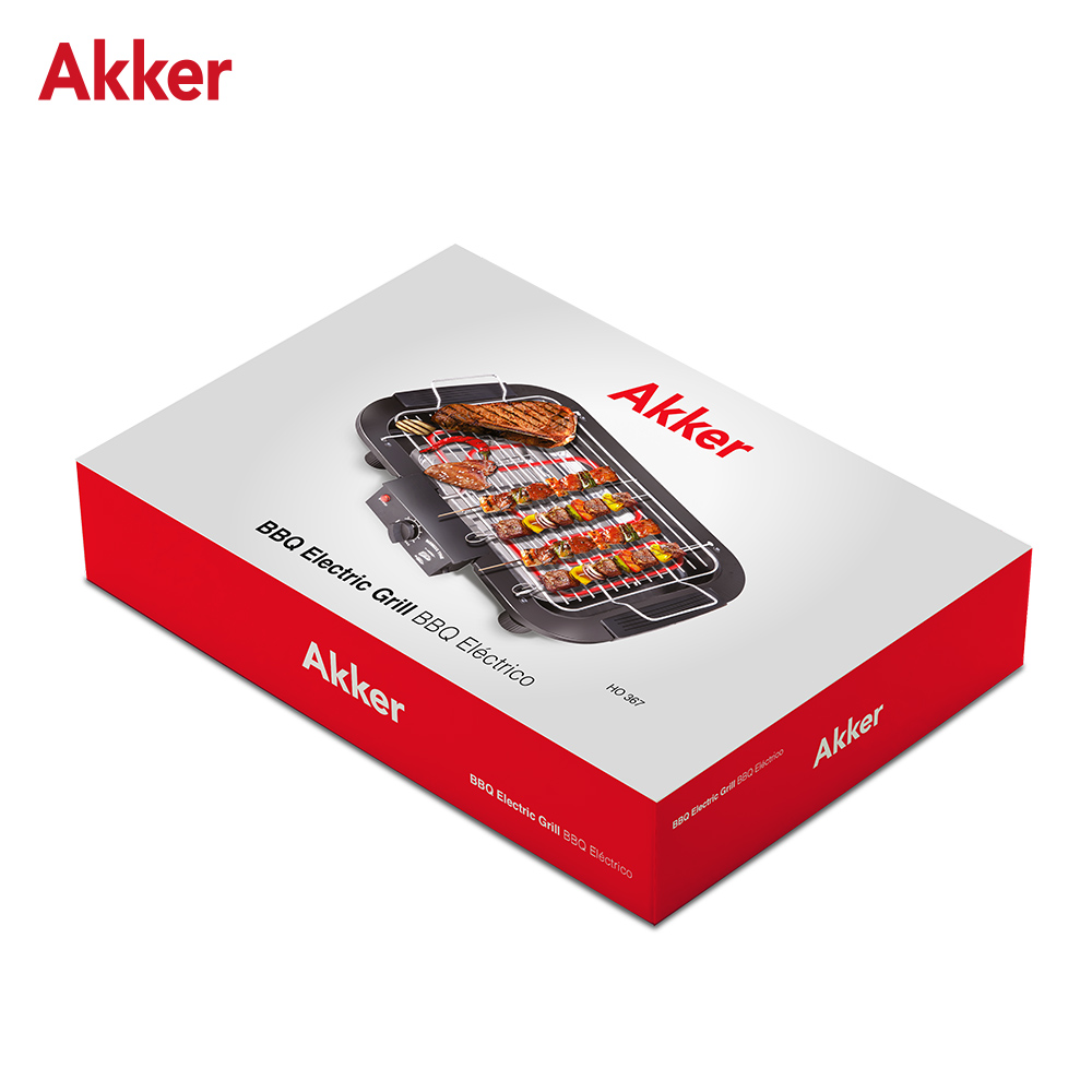 BBQ eléctrico de 1500W. Con luz indicadora de encendido. 3 estados de cocción. Control automático con termostato. Rejilla con 3 niveles de altura. Empaque caja individual.
