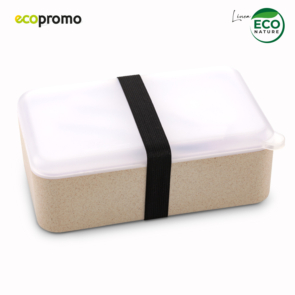 Portacomidas plástico con material ecológico en fibra de trigo, con dos compartimientos. Incluye tenedor, cuchara y elástico.
