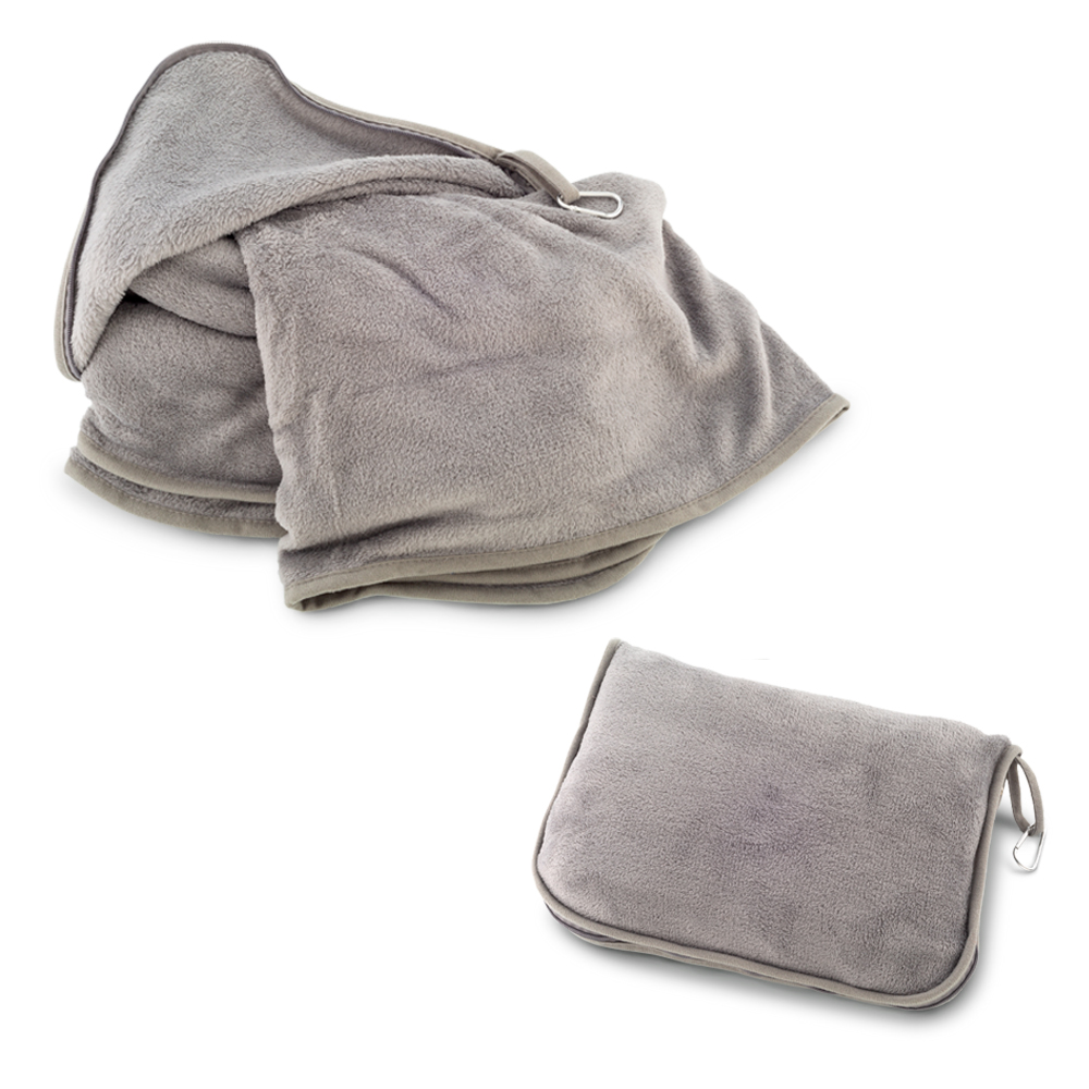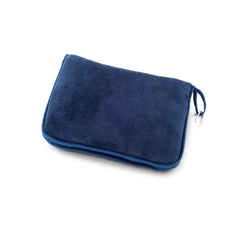 Cobija 100% en poliéster de doble uso. Puede ser usada de dos maneras: de cobija si se abre y de almohada cuando se compacta y se cierra. Bolsa en poliéster con cremallera, carabinero y reata frontal.