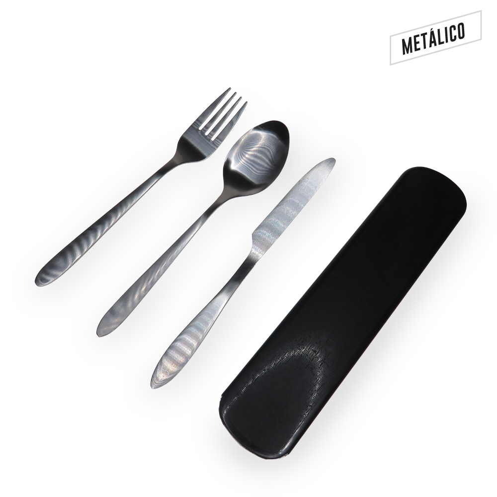 Juego de cubiertos en acero inoxidable (Cuchara, Cuchillo, Tenedor). Estuche en Plástico. Empaque caja individual.