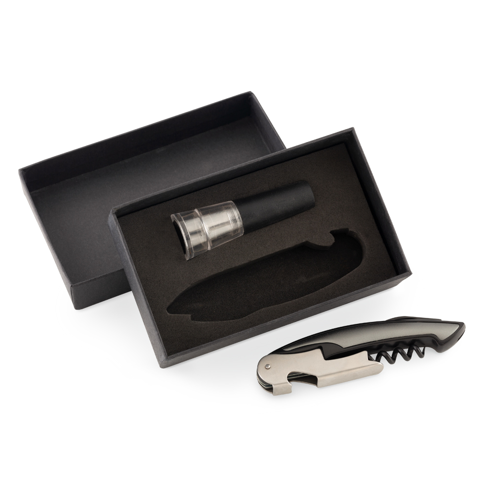Set de vino con descorchador y tapón de vacío. Empaque caja individual.