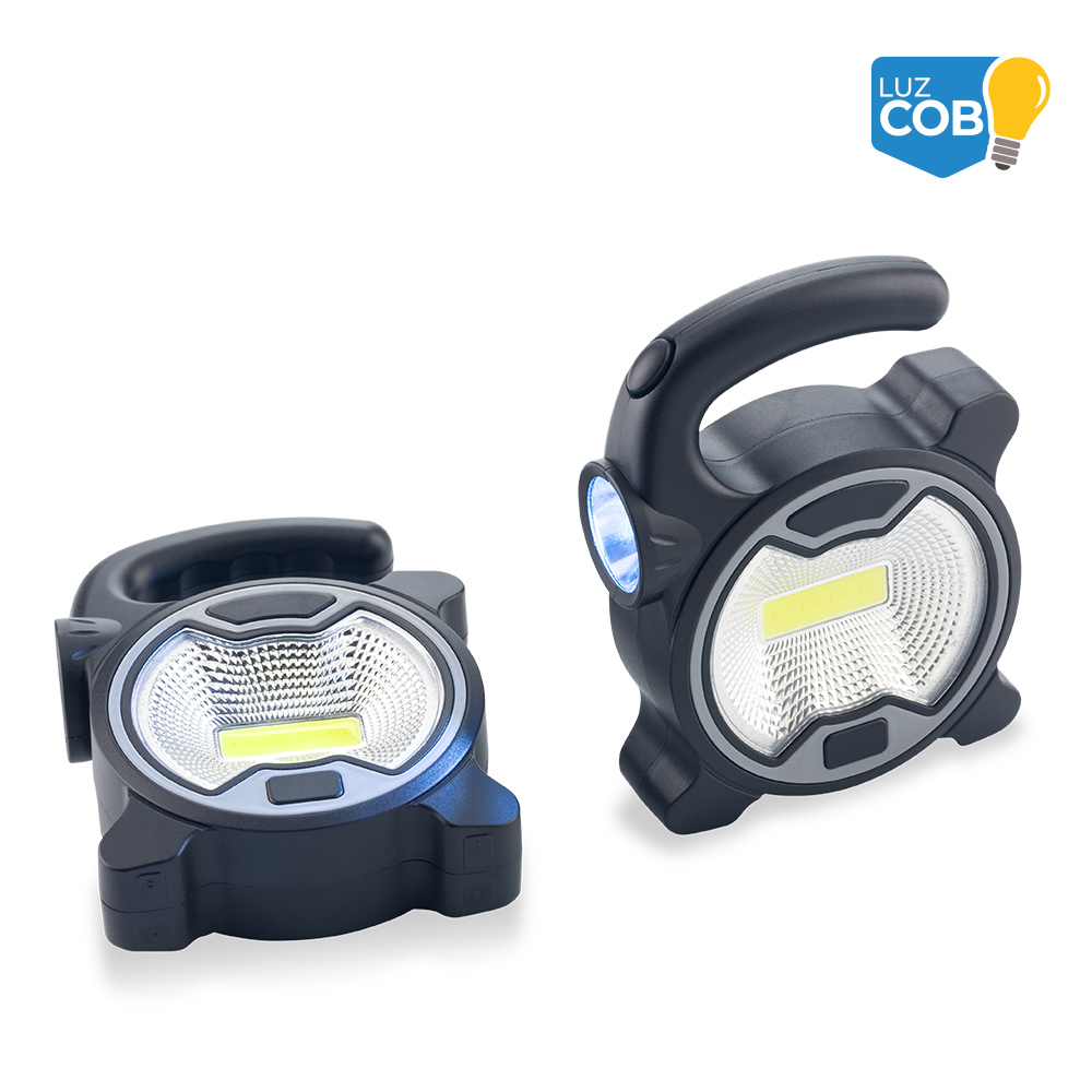 Linterna plastica con luz COB frontal de 2W luz de un LED lateral Manija plastica para facil transporte Pilas 3XAA (no incluidas) Empaque caja individual