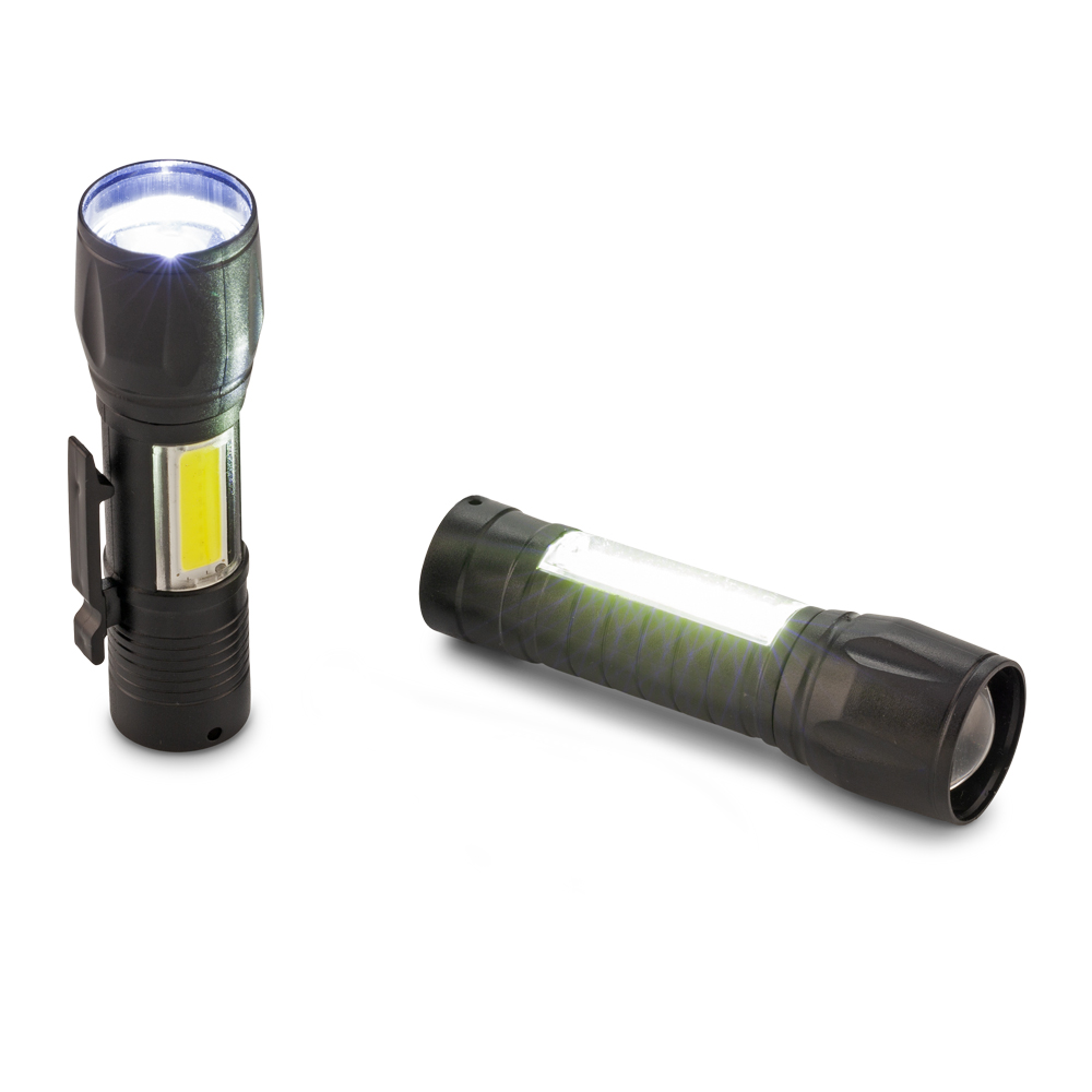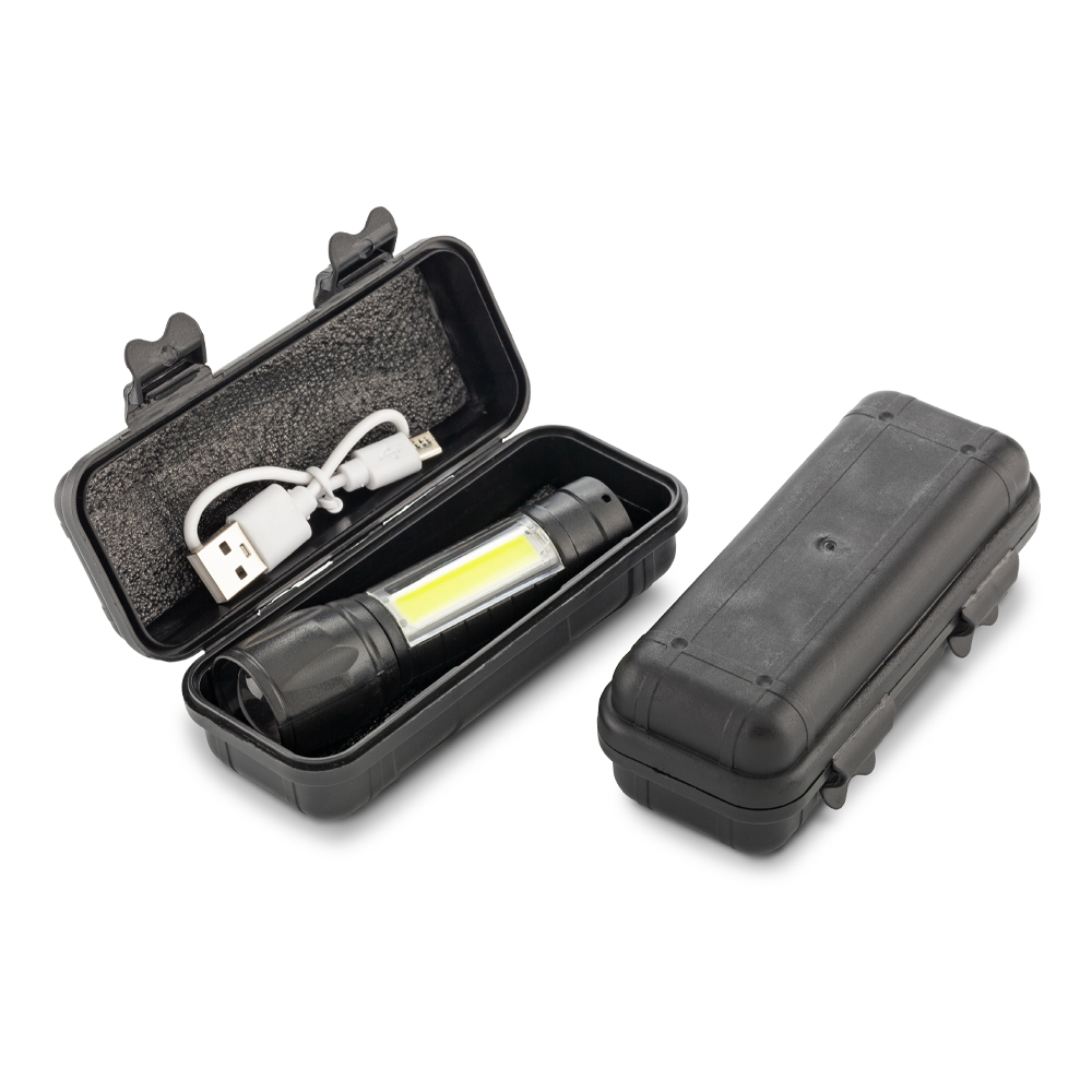 Linterna plástica de 1 LED 3W/80, luz lateral de 3W/130. Moviendo la cabeza de la linterna se puede hacer zoom in o zoom out para mayor precisión al momento de alumbrar. Resistente al agua. Entrada para carga tipo Micro USB. Incluye cable para cargar la batería. Estuche plástico.