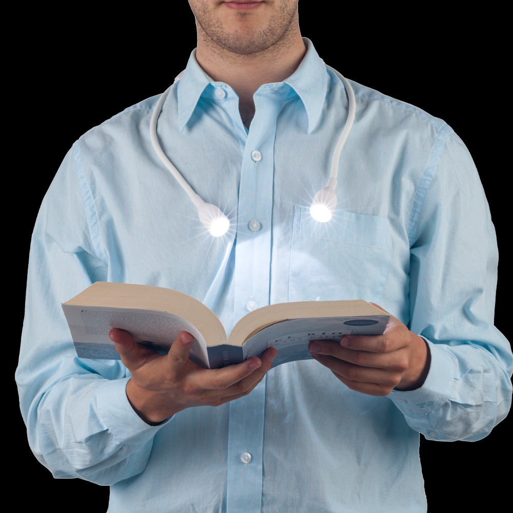 Linterna flexible para colocar en el cuello y facilitar la lectura, 4 LEDS, luz con 3 niveles de intensidad. Recargable. Incluye puerto Tipo C para carga. Empaque caja individual.