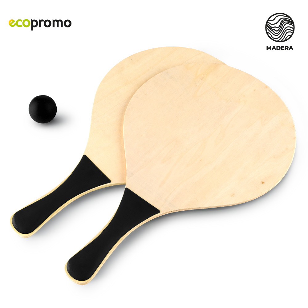 Raquetas para playa en madera con una pelota color negro. Incluyen juego de parqués y juego de ajedrez. Bolsa de malla negra.