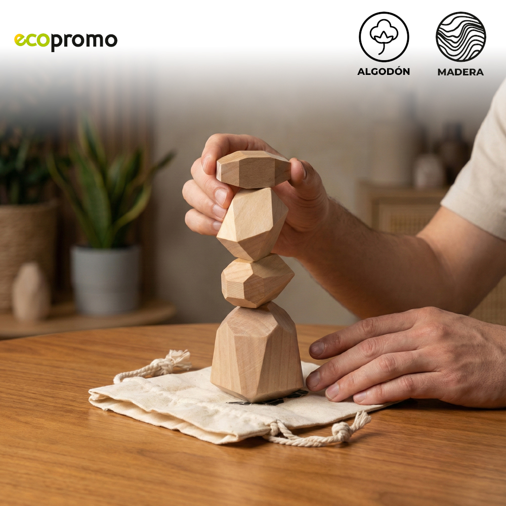 Juego de 4 piezas en madera natural, diseñado para desarrollar habilidades. Con bolsa en algodón.
