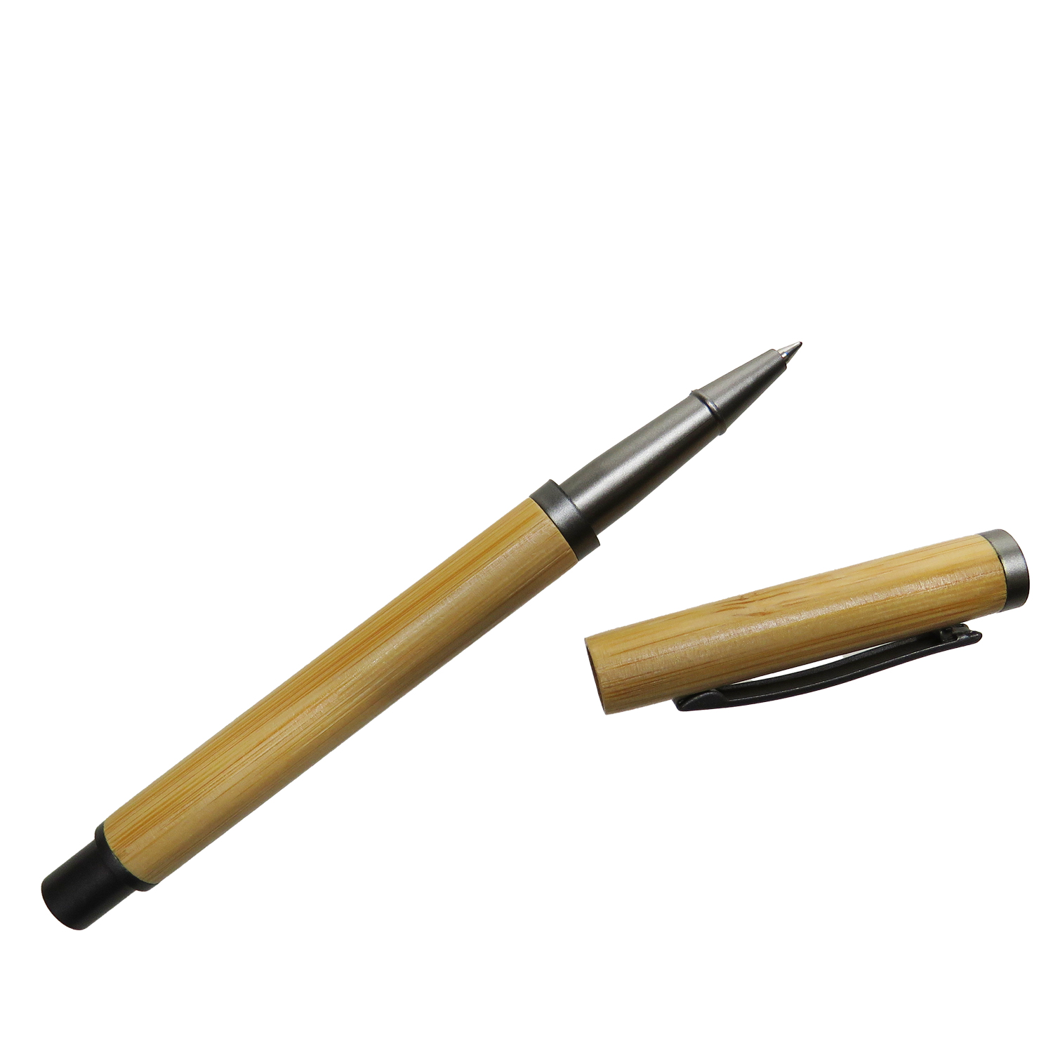 Bolígrafo roller en bambú con tapa y clip metálico.
