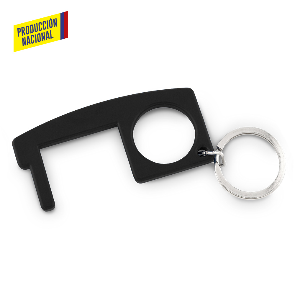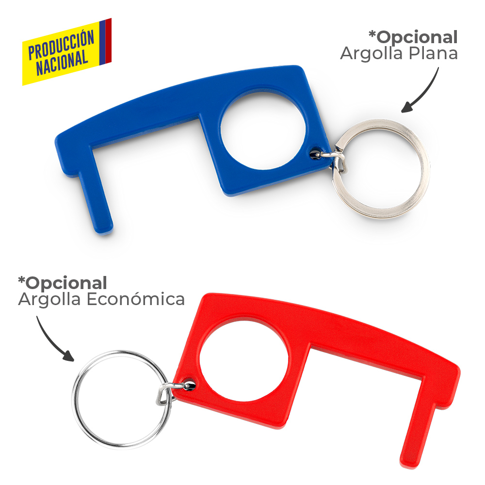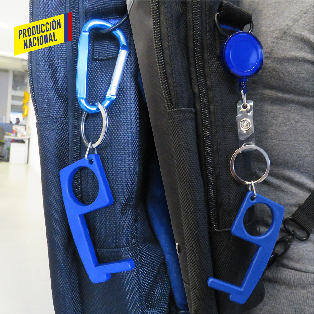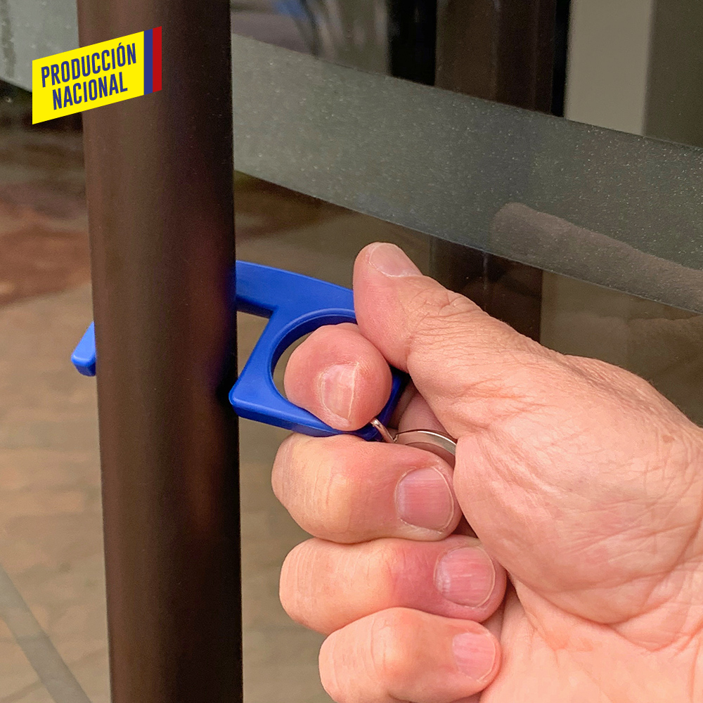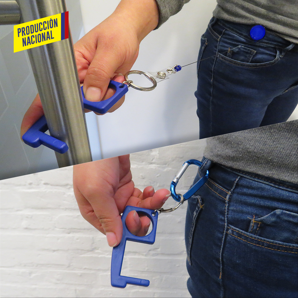 Este llavero ha sido elaborado con plastico ABS resistente y completamente lavable Diseno ergonomico que permite facilmente abrir puertas presionar botones halar palancas Reduce la contaminacion y la exposicion de los dedos a superficies y reduce el area de contacto hasta en 99% Puede usarlo puertas y botones publicos Facil de cargar Limpie despues de cada uso con un elemento desinfectante no abrasivo y seque antes de dos minutos El uso de este elemento no sustituye los protocolos de desinfeccion que deben tener las superficies Empaque bolsa individual Opcional con argolla llavero plana o argolla llavero economica