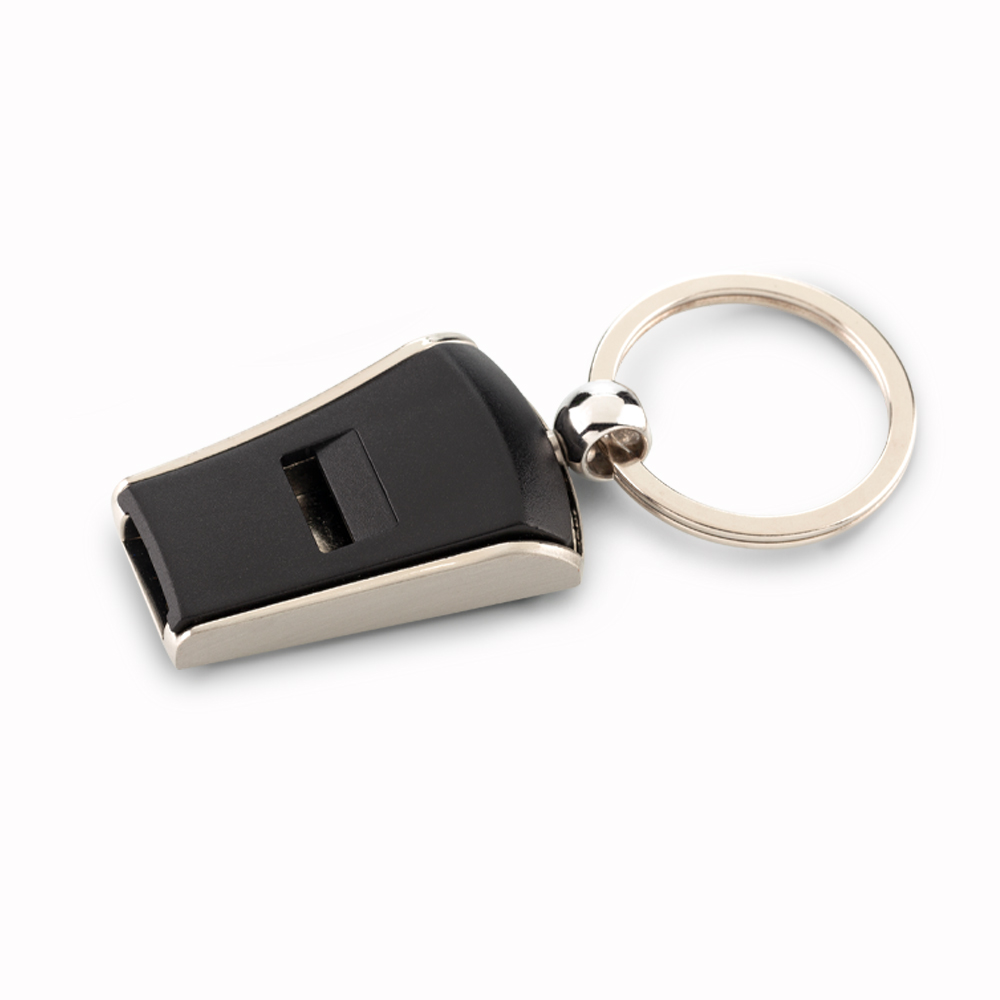 Llavero pito metálico con plástico. Empaque caja individual.