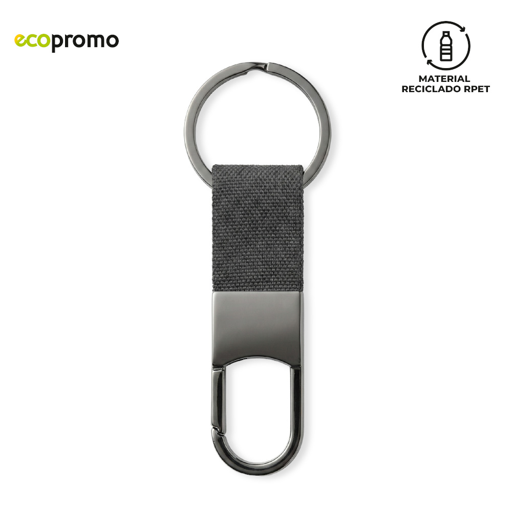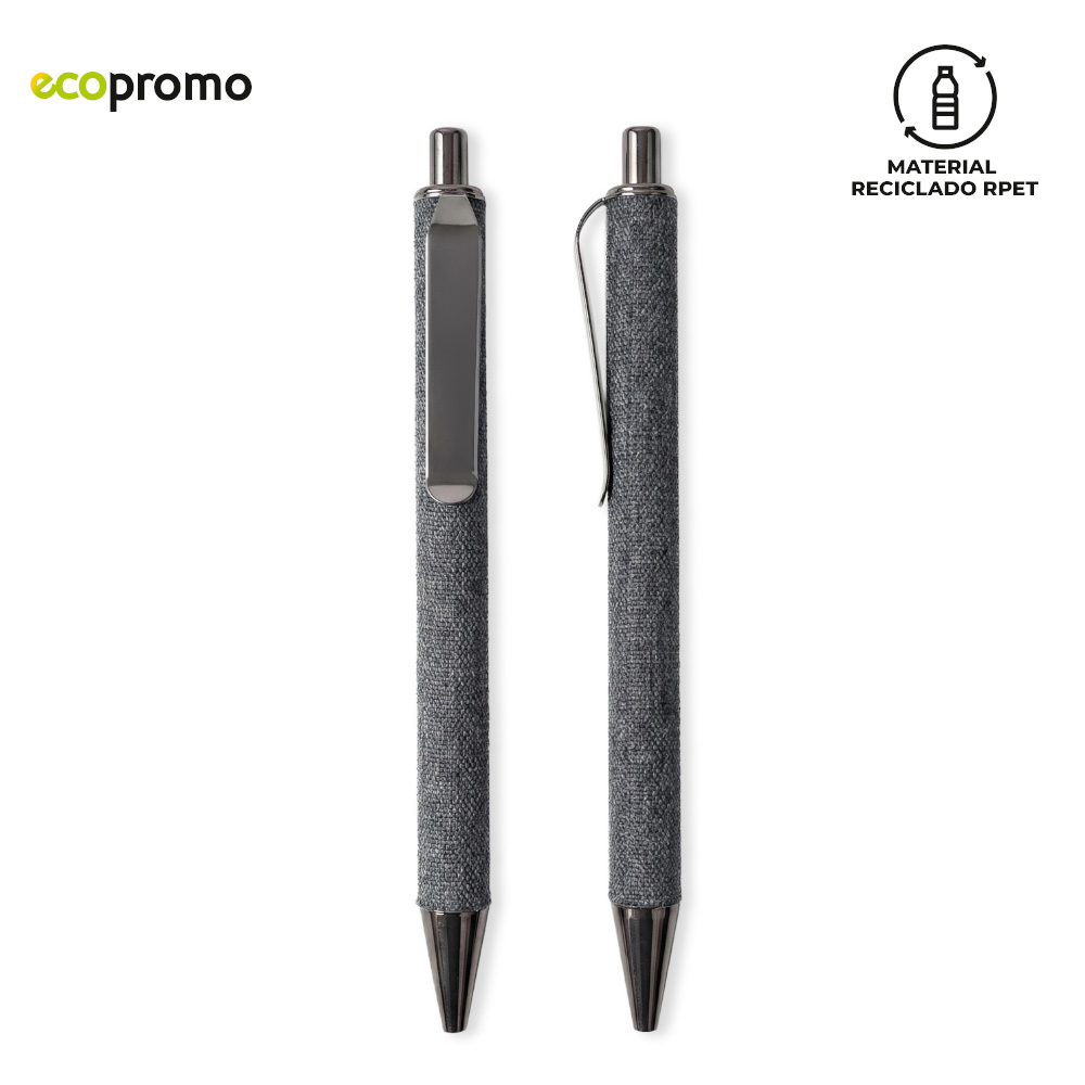 Set de bolígrafo metálico recubierto en tela reciclada RPET y llavero reciclado RPET. Empaque caja individual.