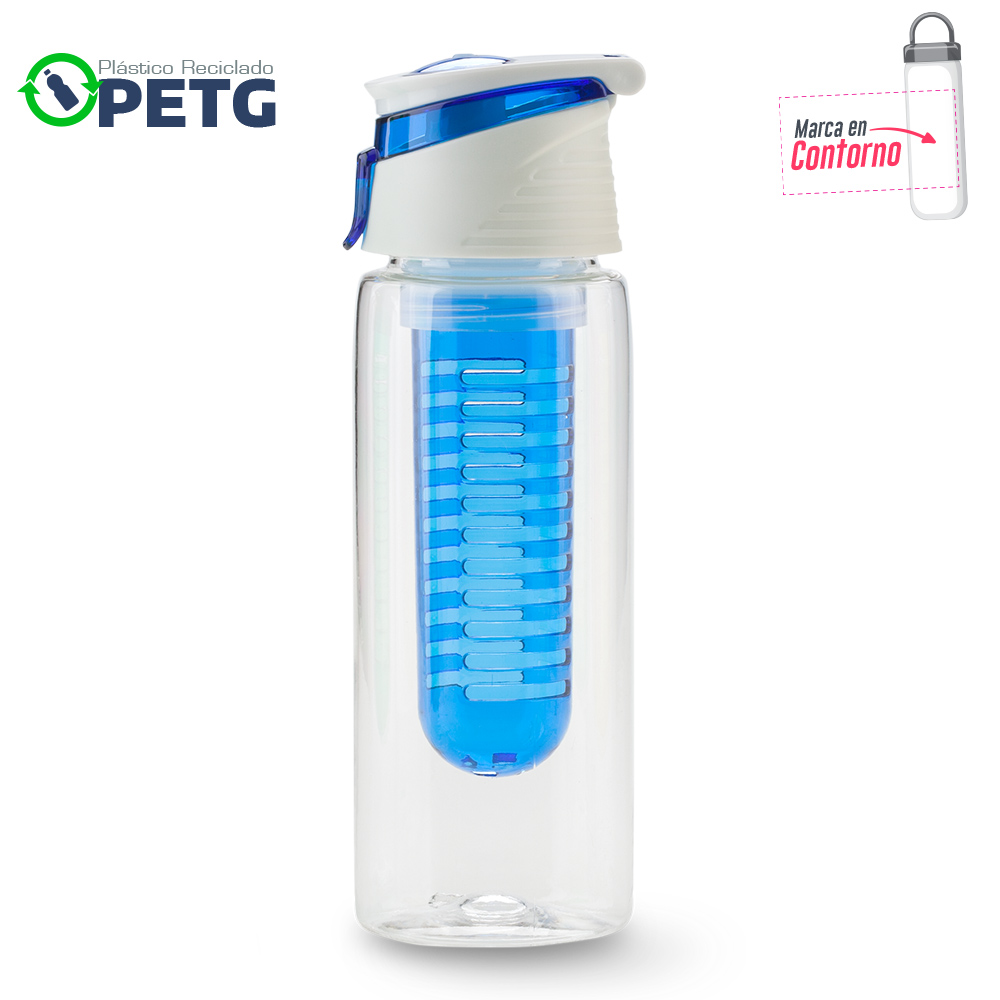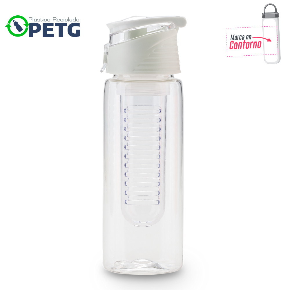 Elaborado en plastico reciclado PETG Material de alta transparencia mayor firmeza y durabilidad libre de BPA resistente al desgaste e impactos menores y reciclable Mantiene liquidos tibios hasta 60C Con infusor Tapa pestana