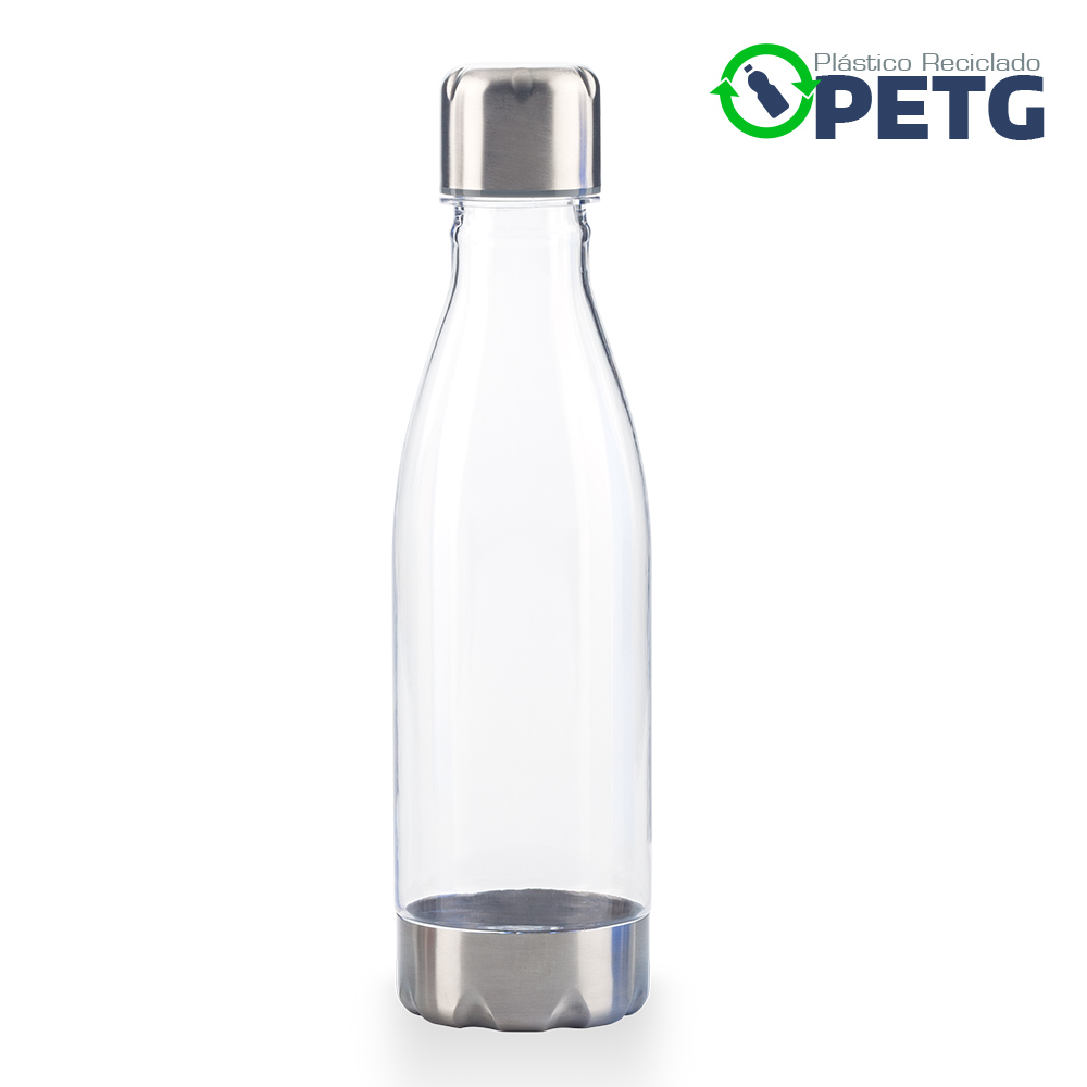 Elaborado en plastico reciclado PETG Material de alta transparencia mayor firmeza y durabilidad libre de BPA resistente al desgaste e impactos menores y reciclable Mantiene liquidos tibios hasta 65C Tapa rosca y base metalica