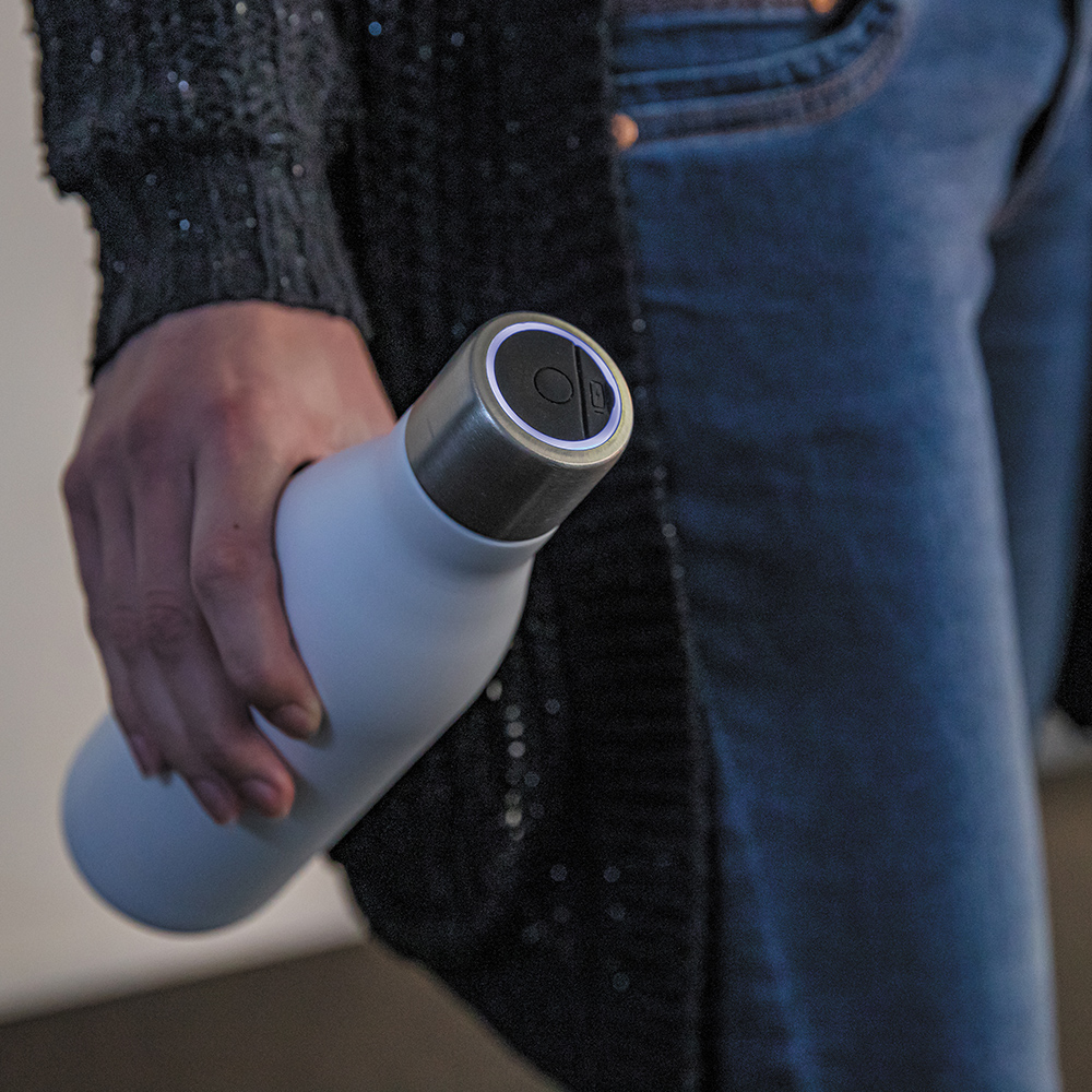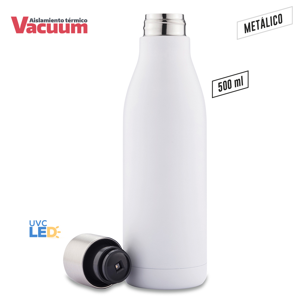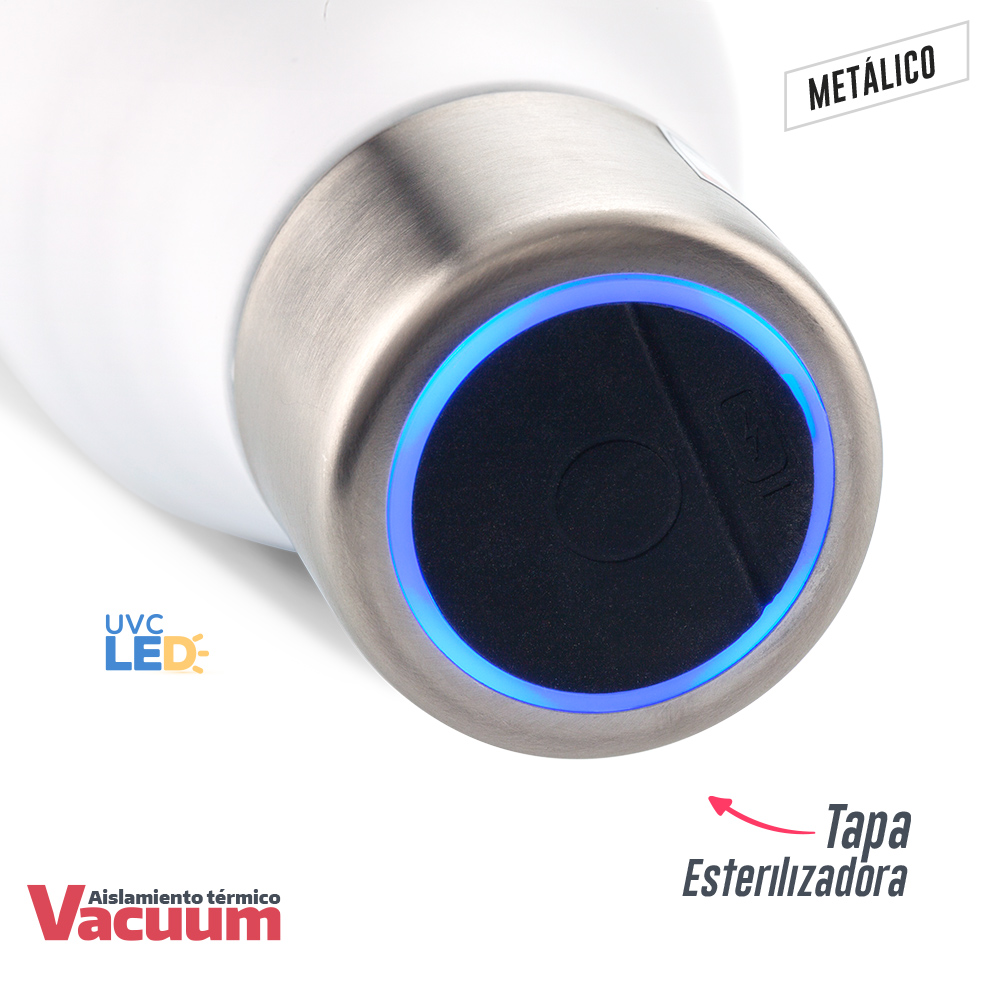 Doble pared en acero inoxidable con aislamiento termico que mantiene la bebida fria entre 8-10h aprox o caliente 3-4h aprox (puede variar dependiendo condiciones climaticas) Tapa rosca con interior plastico y luz UV-C LED esterilizadora que funciona en ciclos de 3 y 5 minutos Bateria recargable incorporada para el esterilizador de 400mAh No apto para bebidas carbonatadas no apto para microondas no apto para lavavajillas Empaque caja individual