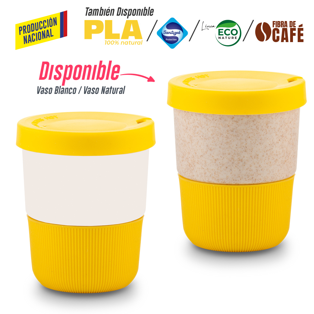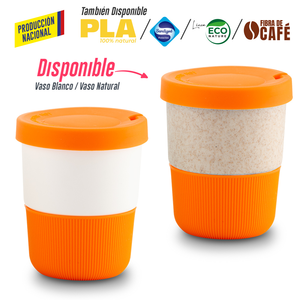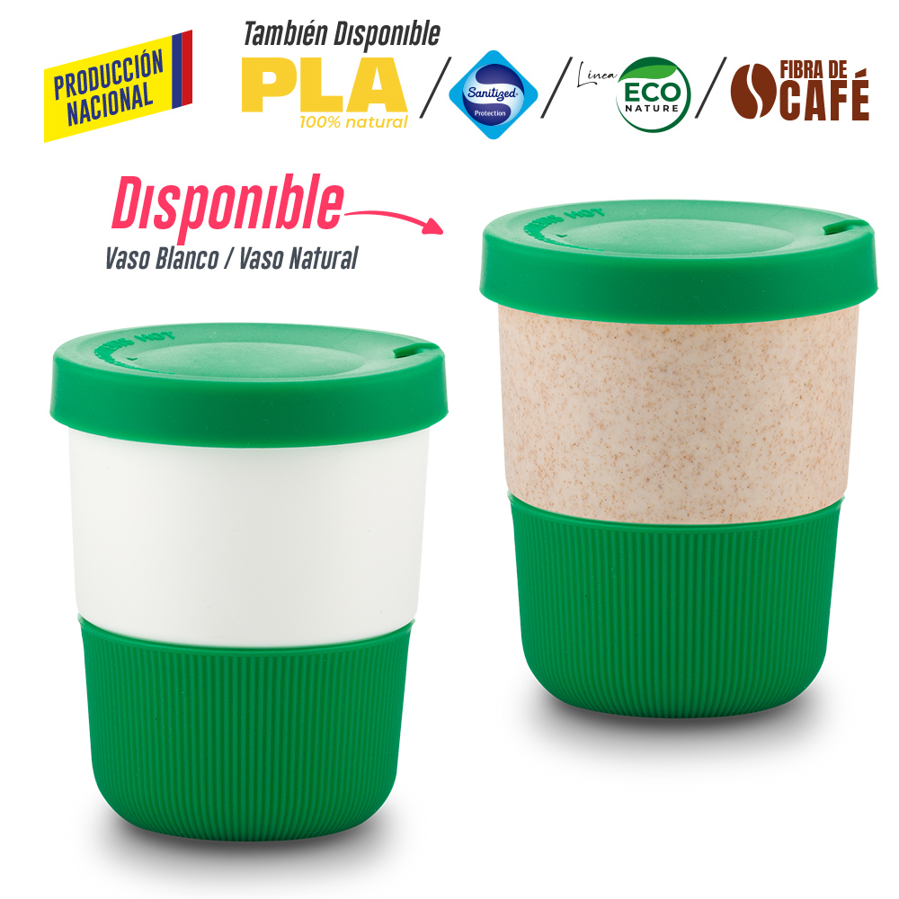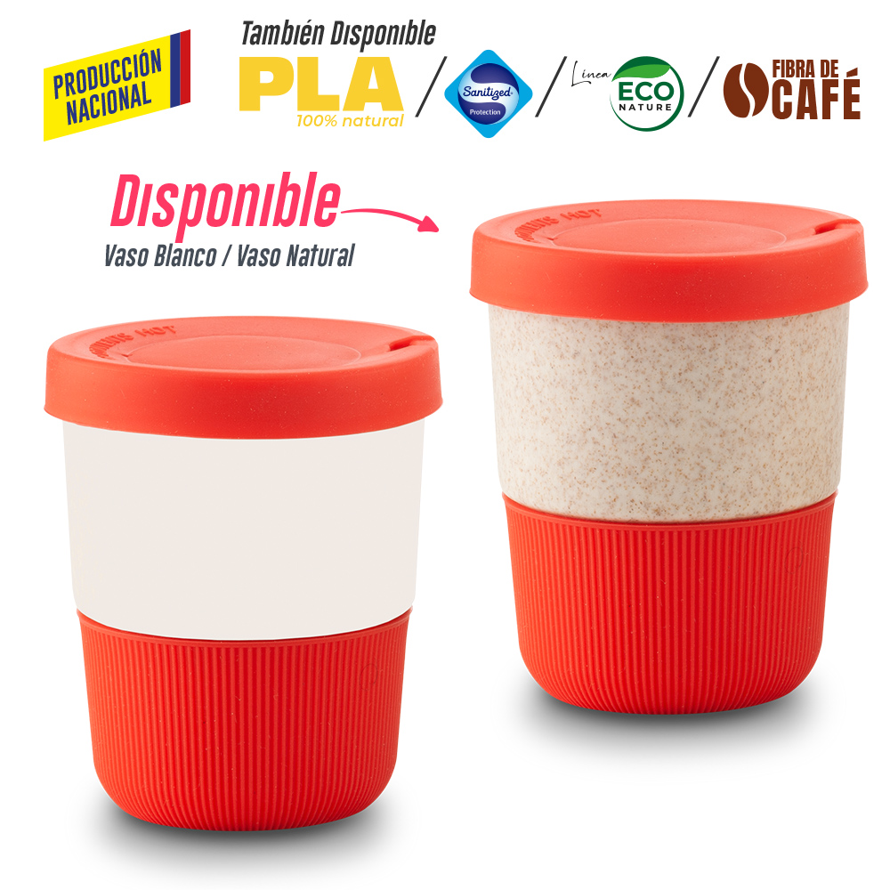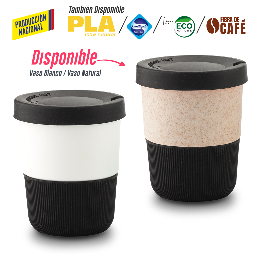 Vaso blanco en polipropileno o vaso natural polipropileno y mezcla con material ecologico en fibra de trigo (50% aprox) El porcentaje de material ecologico tiene un promedio de biodegradabilidad de 2-3 anos despues del fin de su vida util Tapa y base en silicona importada La tapa es una tapa protectora de cierre a presion no es tapa de seguridad
