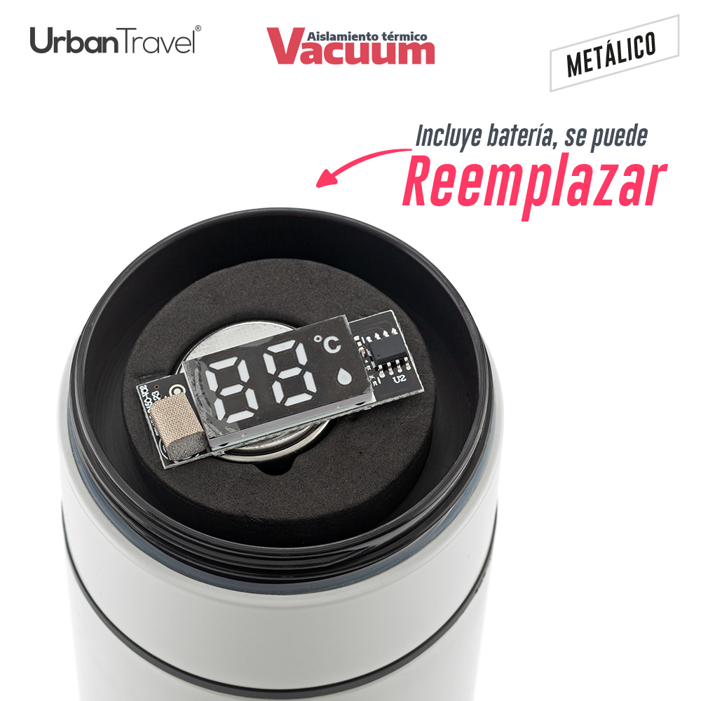 Termo doble pared en acero Inoxidable con aislamiento termico que mantiene la bebida fria o caliente hasta 6h aprox (puede variar dependiendo condiciones climaticas) Tapa con indicador de temperatura del liquido interior que se activa con un toque y filtro metalico interno Incluye bateria la cual se puede reeemplazar Empaque caja individual