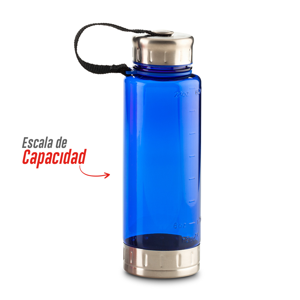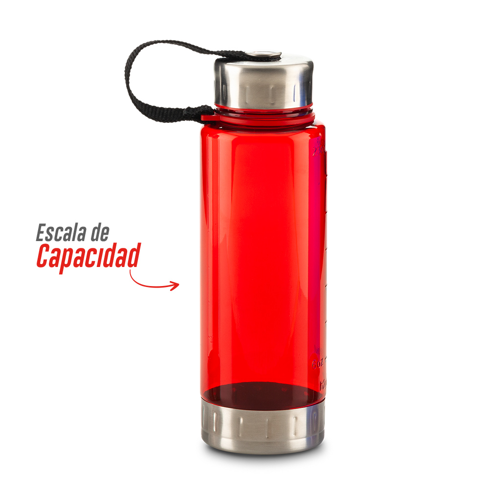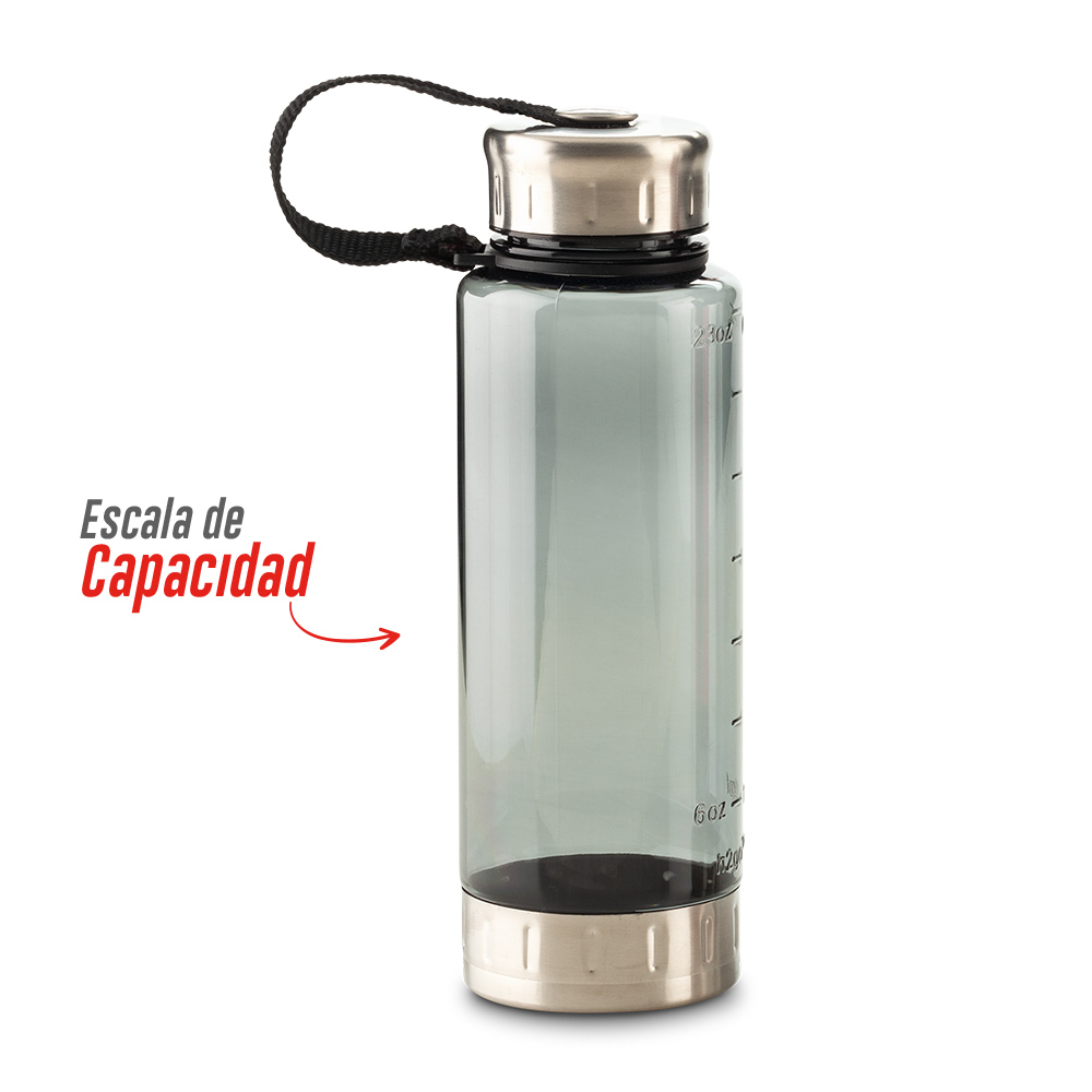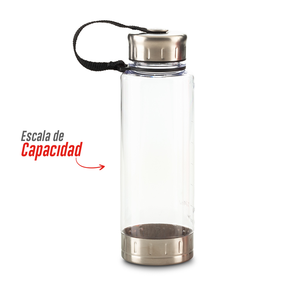 Botilito plastico en AS con tapa metalica y escala de capacidad que ayuda a comprobar la cantidad de liquido de forma facil y clara Libre de BPA