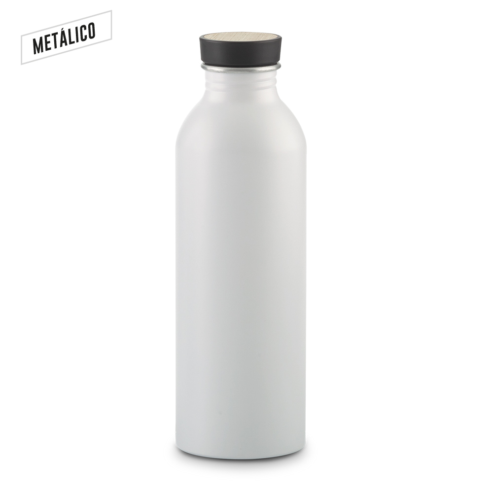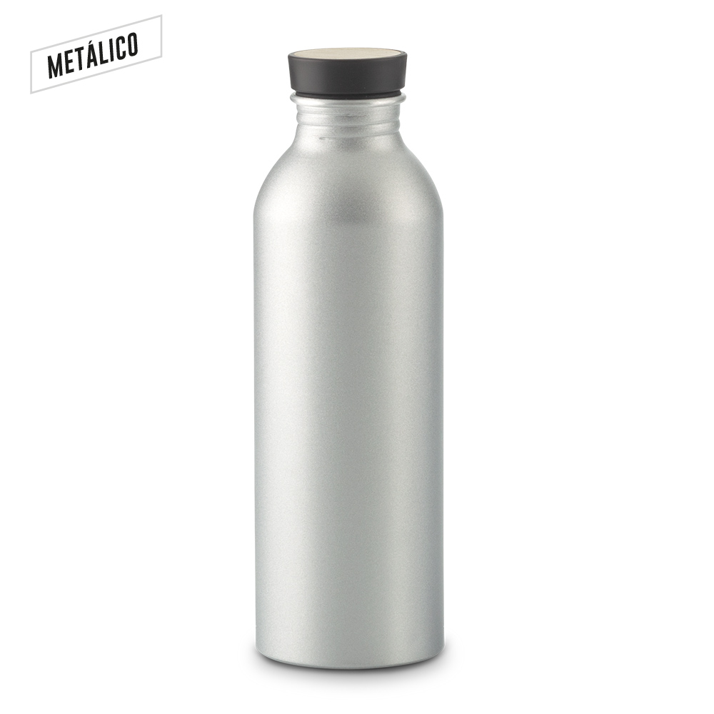 Botilito en aluminio con tapa en plastico y bambu Empaque caja individual