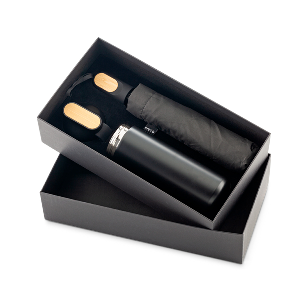 Set ecológico de botilito doble pared vacuum en acero inoxidable reciclado, con aislamiento térmico que mantiene la bebida fría o caliente hasta 6h, aprox (puede variar dependiendo condiciones climáticas). Con tapa rosca y detalle en bambú y Mini paraguas de 21" en poliéster reciclado RPET, con apertura automática, mango en caucho, herraje metálico. Con forro. Empaque caja individual.