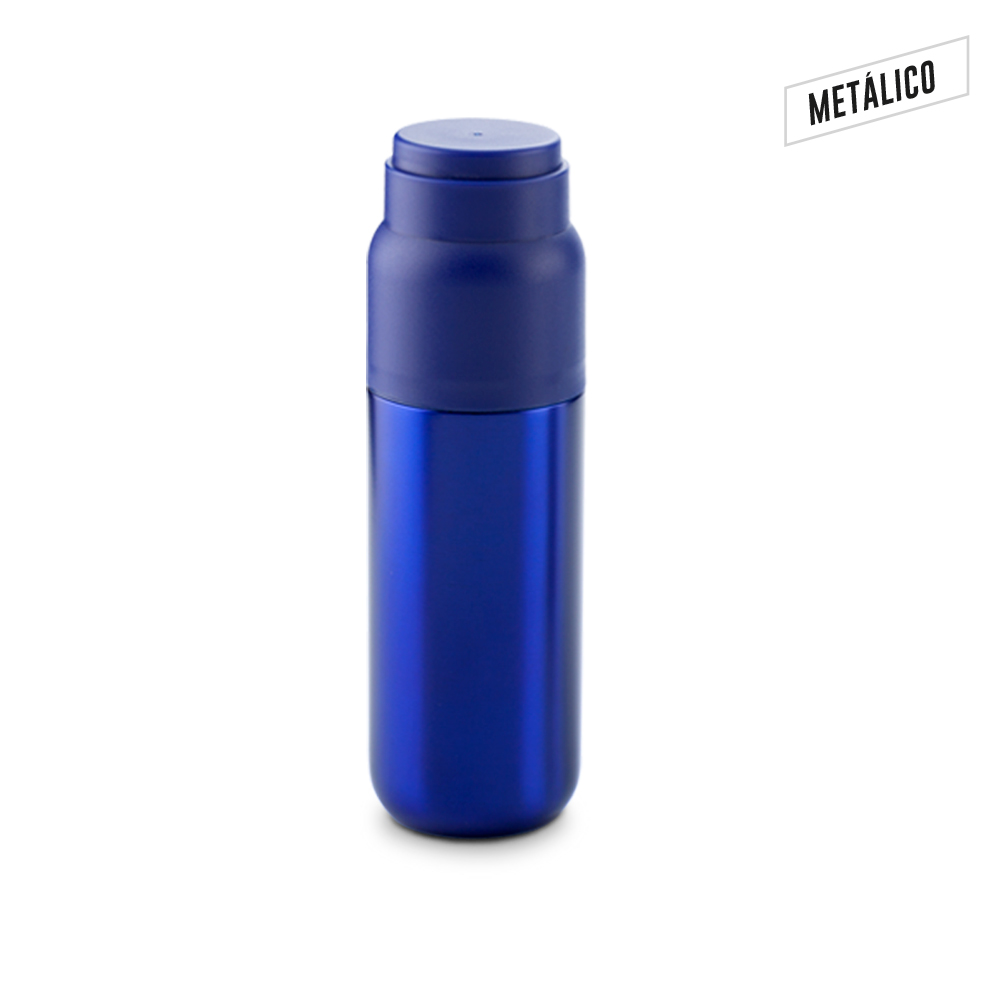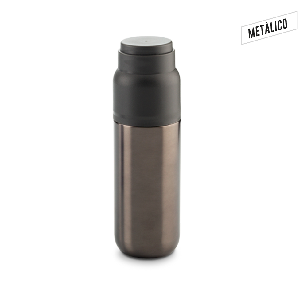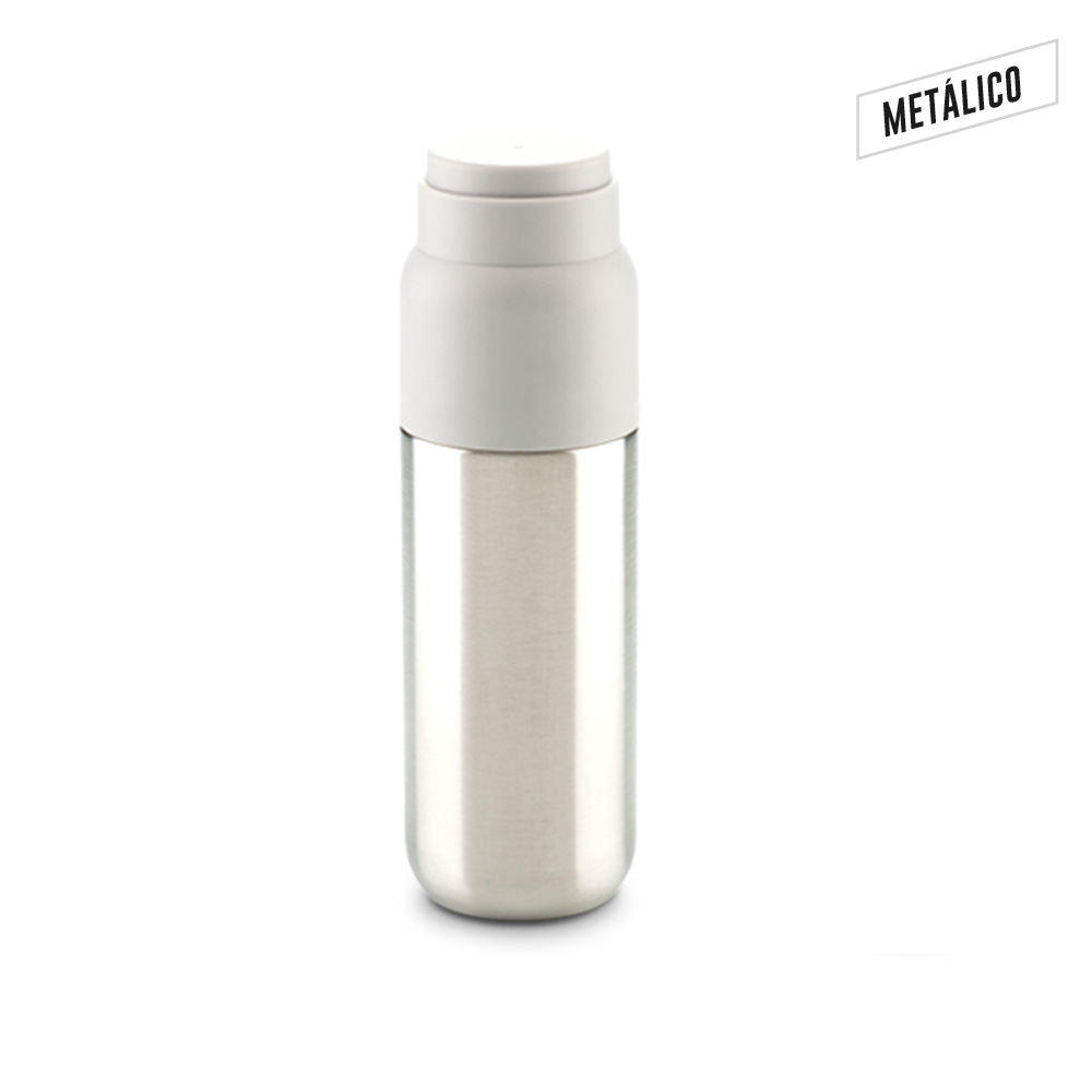 Botilito doble pared vacuum en acero inoxidable, con aislamiento térmico que mantiene la bebida fría o caliente hasta 6h, aprox (puede variar dependiendo condiciones climáticas). Una tapa plástica con función rosca y regulador para servir las bebidas. Una tapa plastíca la cuál funciona como vaso. Empaque caja individual.