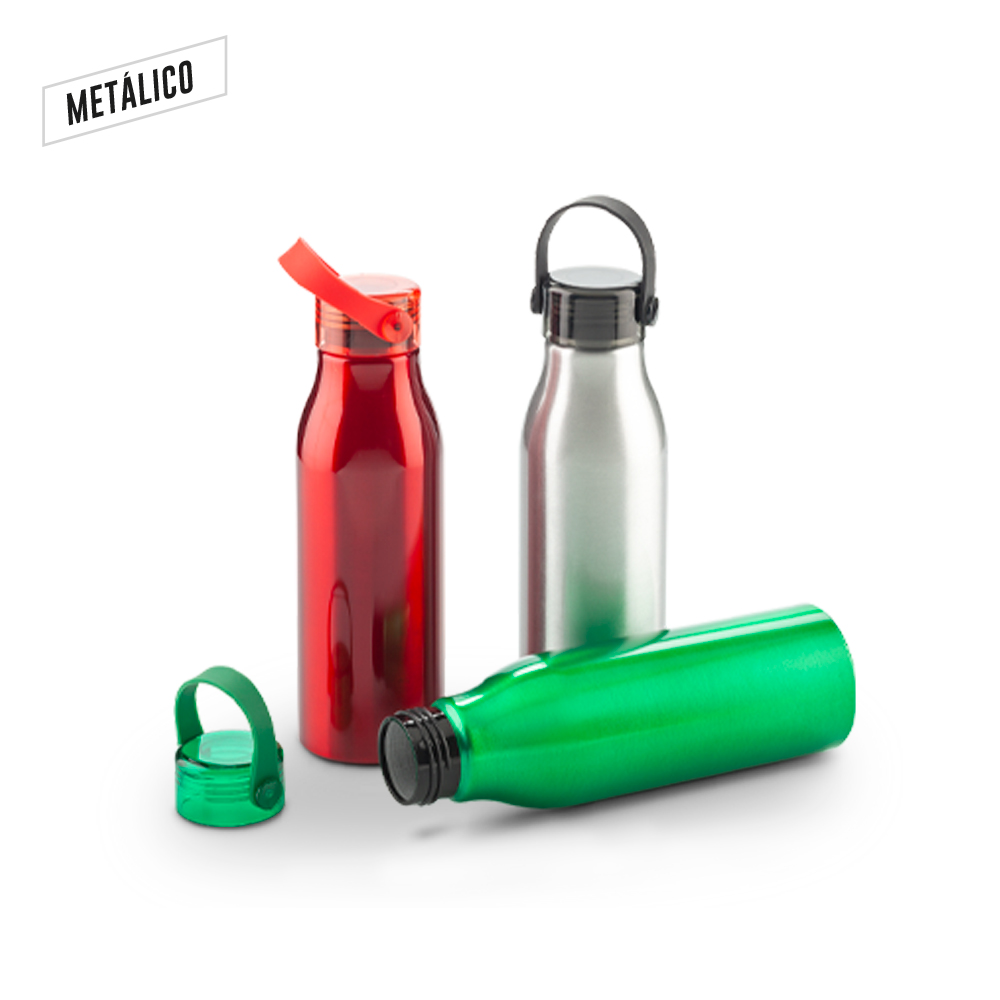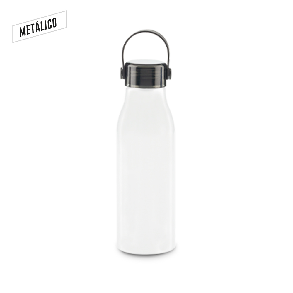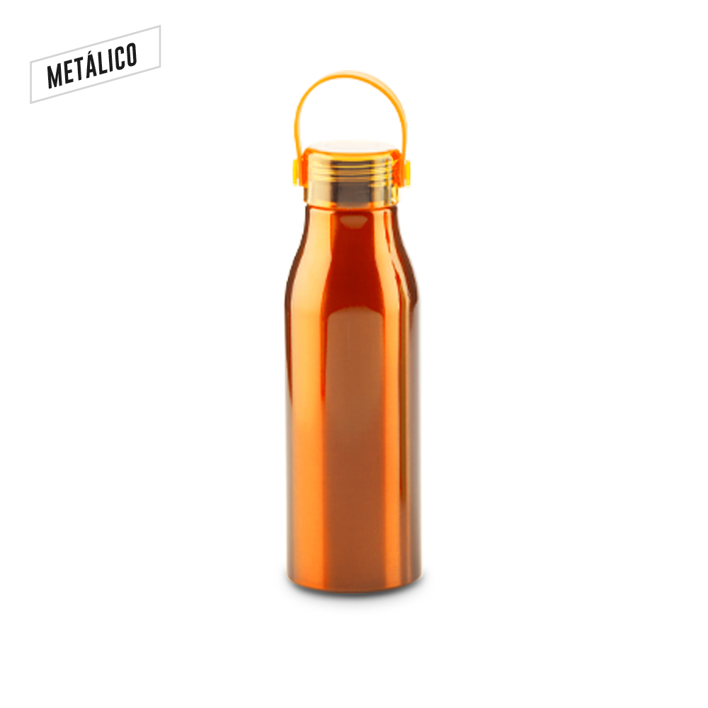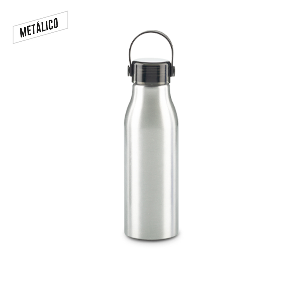 Botilito en aluminio con tapa rosca y agarradera en caucho. Empaque caja individual.
