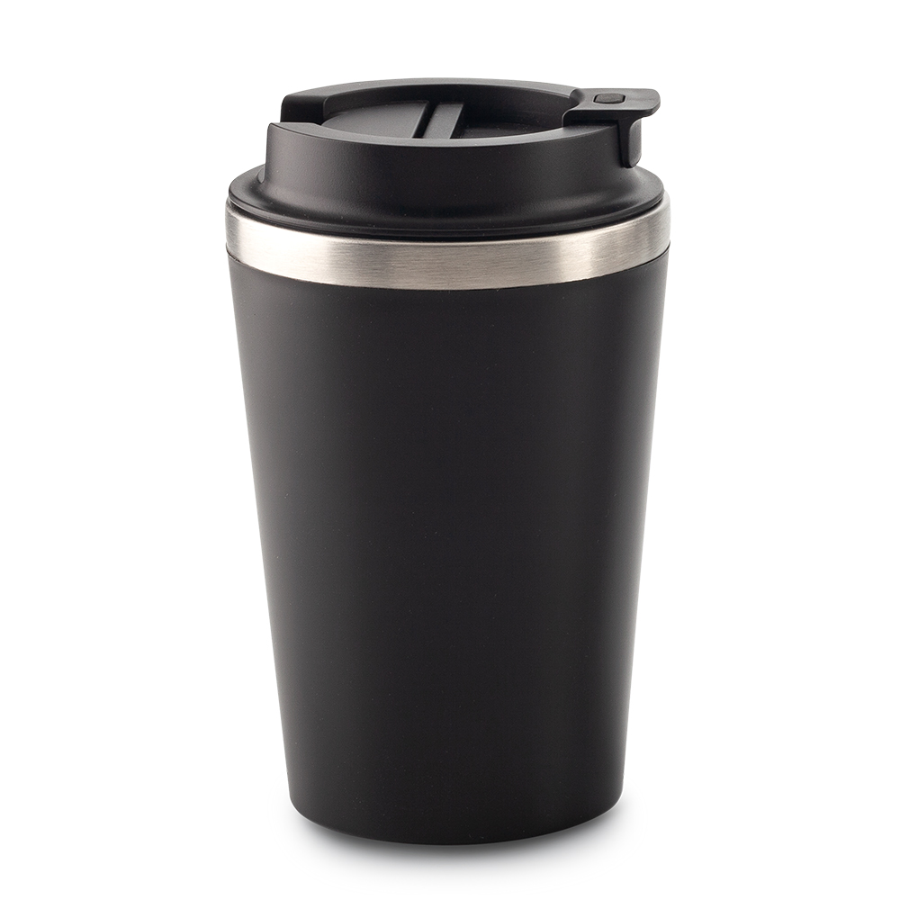 Mug plástico con interior en acero inoxidable. Taparosca de seguridad. Empaque caja individual.
