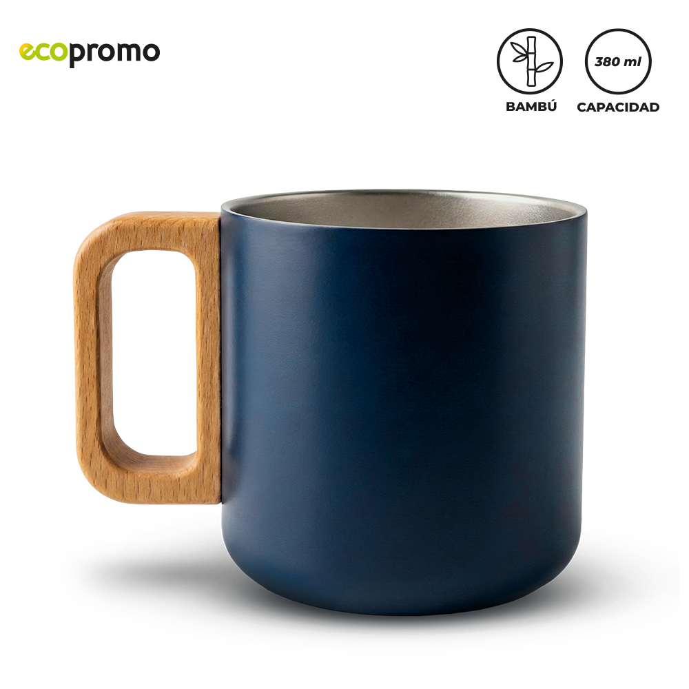 Mug en acero inoxidable doble pared con manija en bambú. Empaque caja individual.