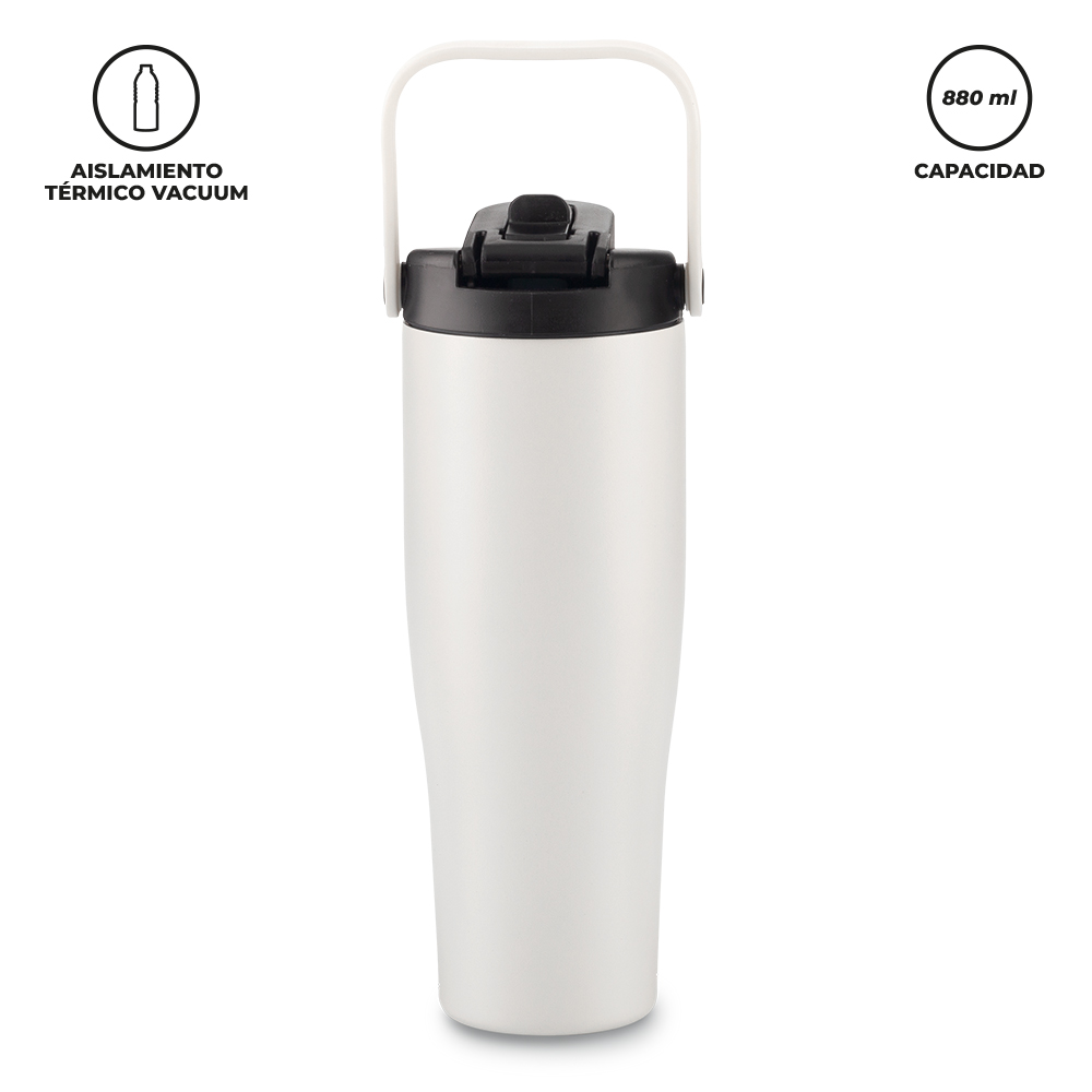 Mug metálico doble pared vacuum en acero inoxidable, con aislamiento térmico que mantiene la bebida fría entre 8-10h aprox o caliente 3-4h aprox (puede variar dependiendo de las condiciones climáticas). Tapa rosca plástica con pitillo y chupo. Manija para cargarlo. Empaque caja individual.