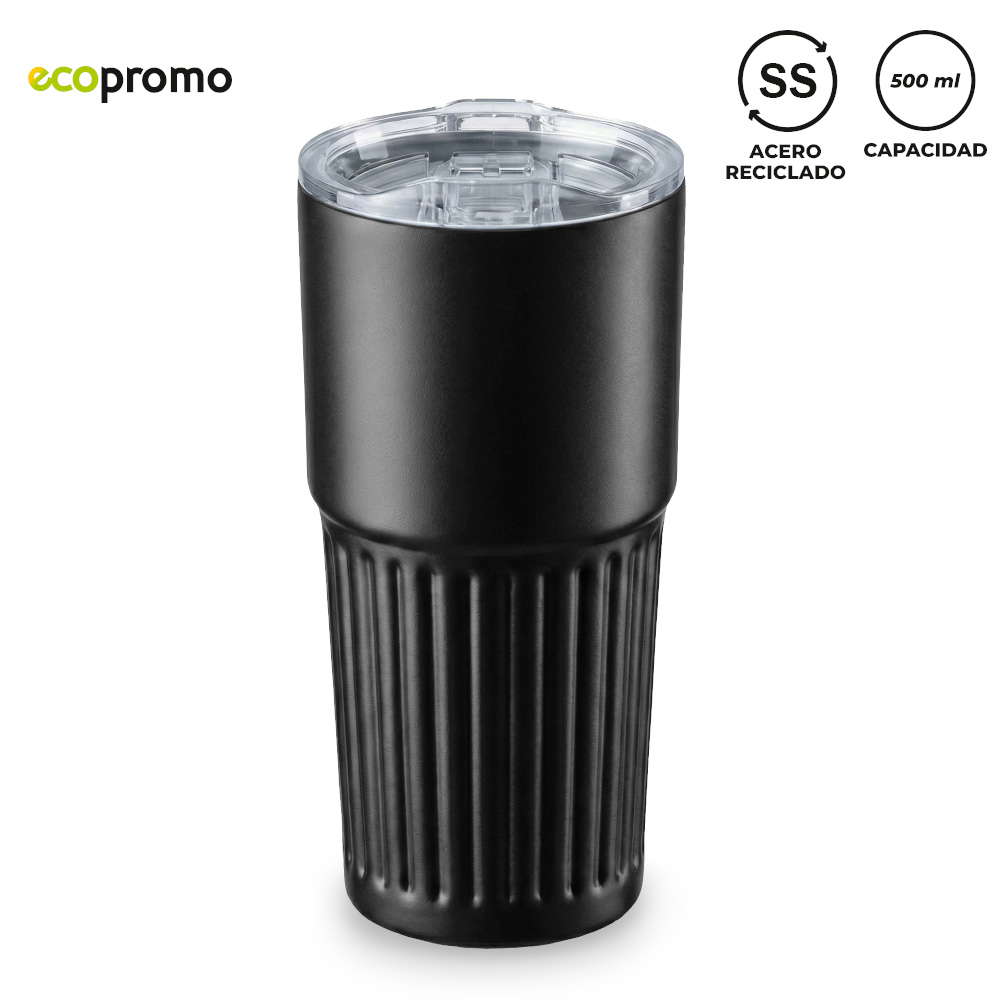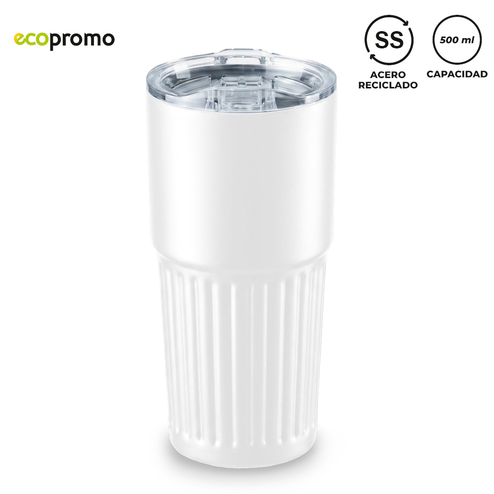 Mug metálico doble pared en acero inoxidable reciclado.La tapa es una tapa protectora de cierre a presión, no es tapa de seguridad. Empaque caja individual.