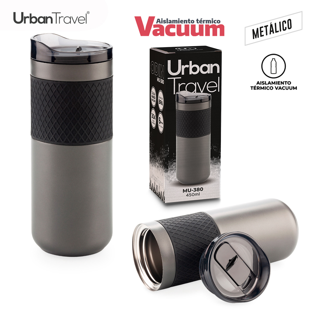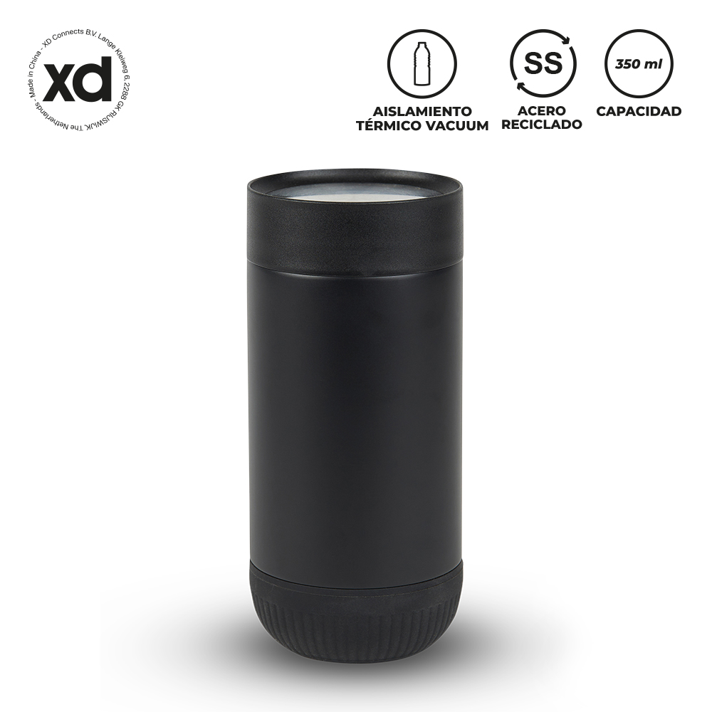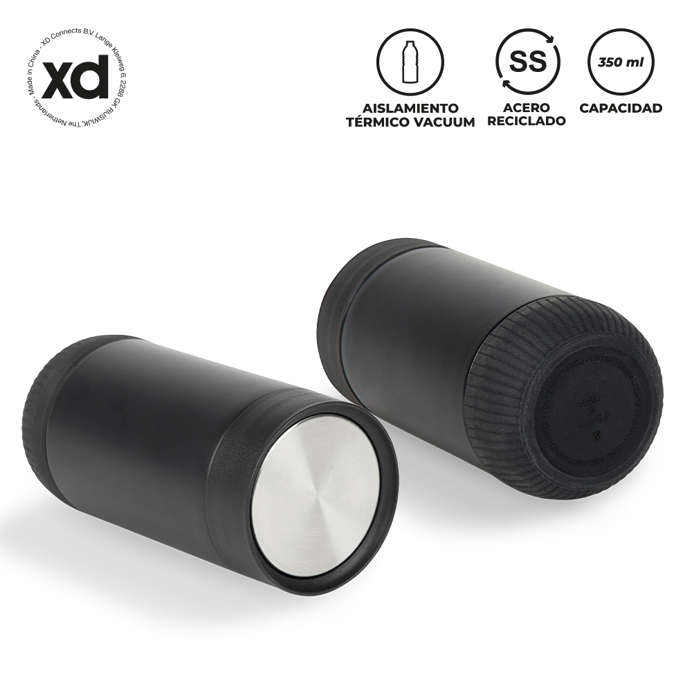 MUG METÁLICO VINGA ECO 350 ML Mug doble pared vacuum en acero inoxidable reciclado, con aislamiento térmico que mantiene la bebida fría entre 8-10h aprox o caliente 3-4h aprox (puede variar dependiendo las condiciones climáticas). Tapa rosca push y base en caucho. Estuche caja individual.