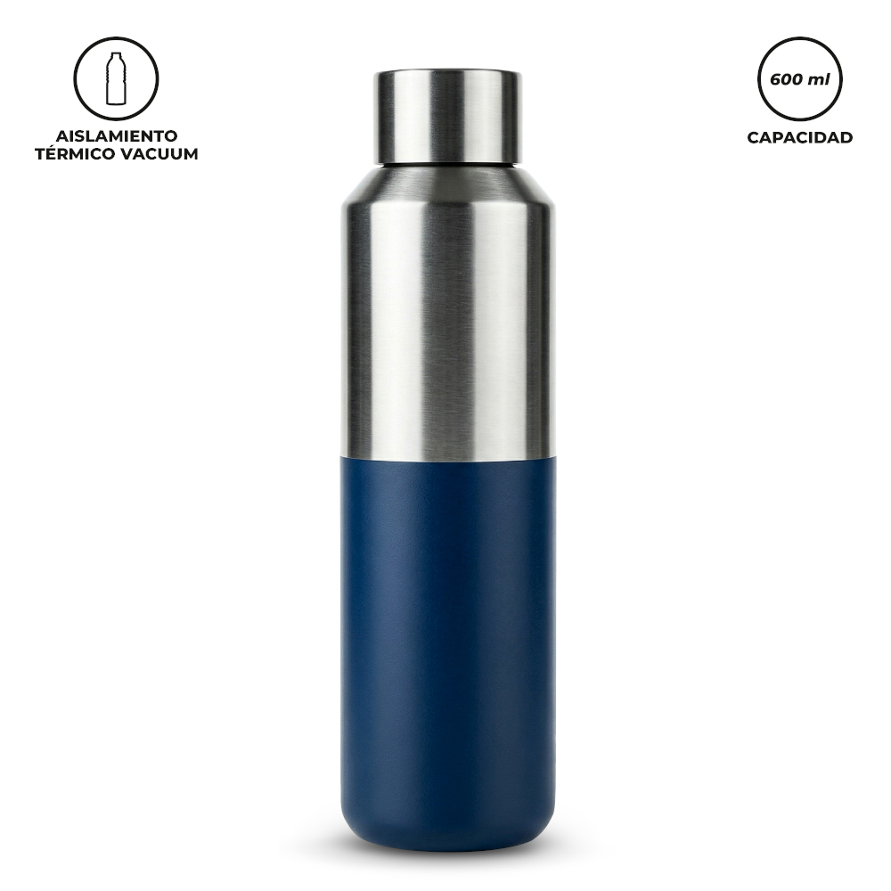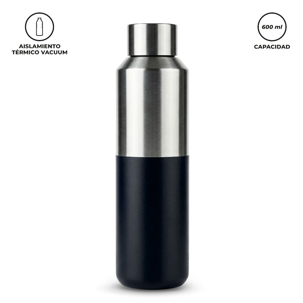Botilito doble pared vacuum en acero inoxidable, con aislamiento térmico que mantiene la bebida fría o caliente hasta 6h aprox (puede variar dependiendo de las condiciones climáticas), con tapa rosca. Empaque caja individual.