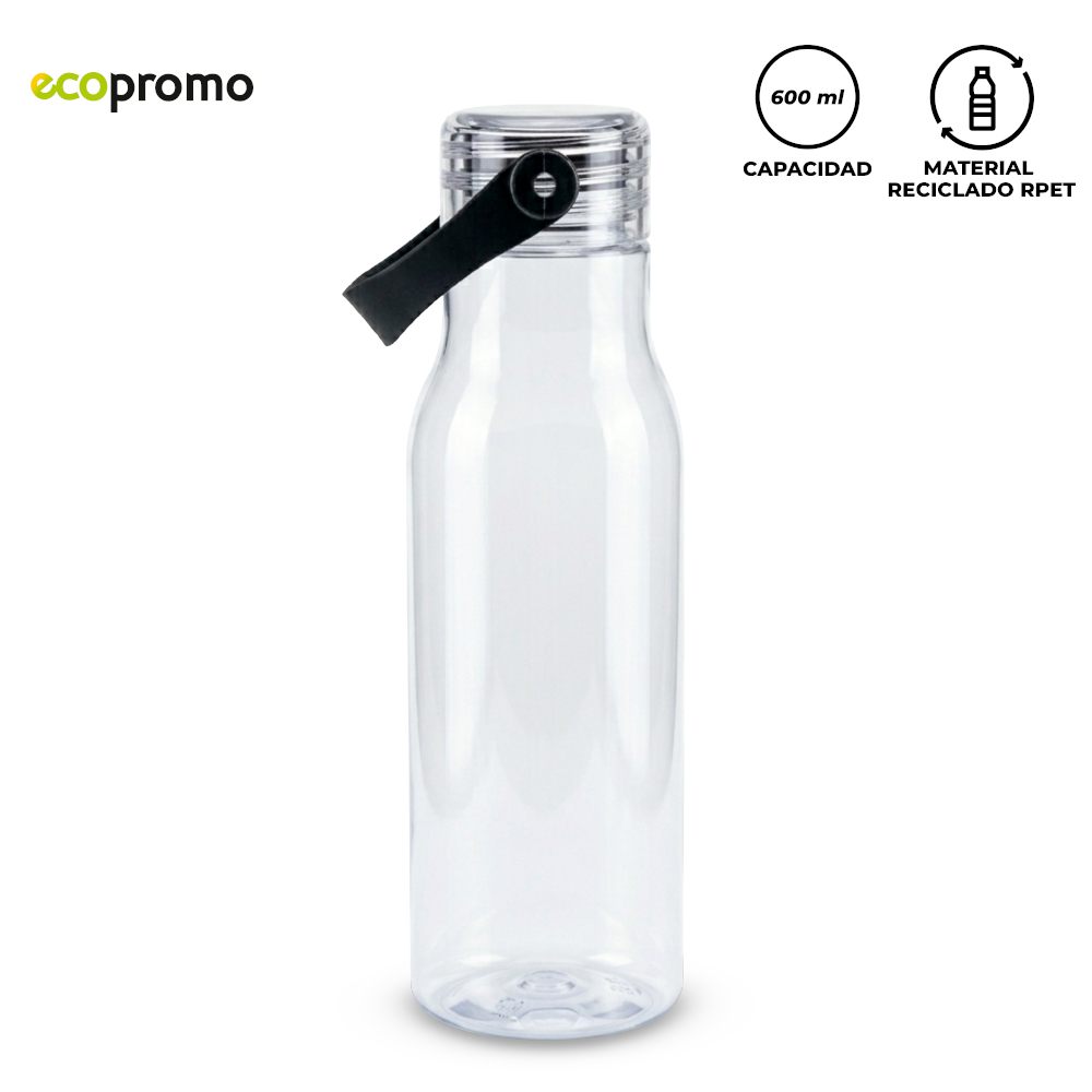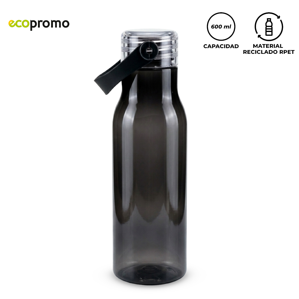Botilito plástico reciclado RPET. Tapa plástica tipo rosca y agarre en silicona.