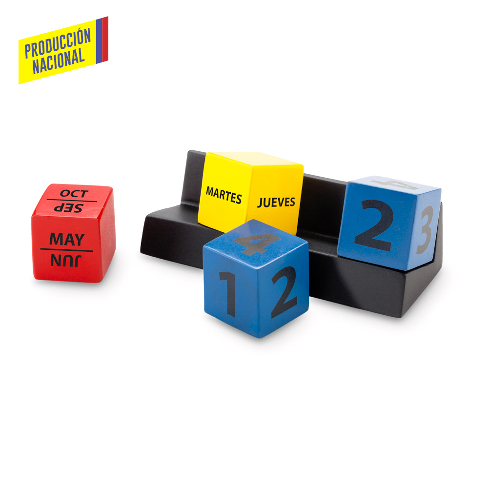 Base elaborada en MDF con pintura catalizada incluye 4 cubos (1 amarillo 1 rojo y 2 azules) con dias de la semana meses y con numero del dia Empaque caja Individual
