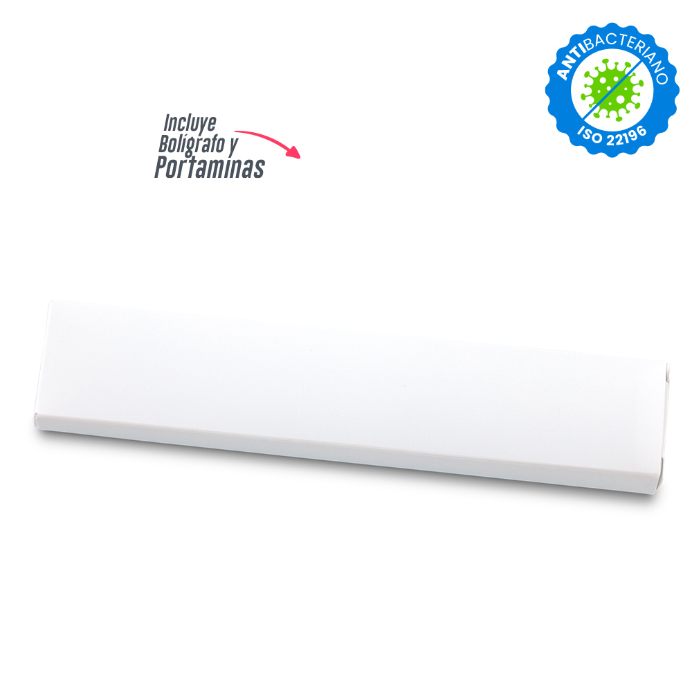 Set elaborado en ABS con material antibacteriano Incluye boligrafo portaminas (mina 0 5mm) regla estuche y borrador blanco Plastico antibacteriano tratado para inhibir y prevenir el crecimiento bacteriano gracias a la tecnologia nano silver un tratamiento especial realizado con iones de plata Las bacterias al contacto con el material se repelen y reducen hasta en 99% Trabaja las 24 horas al dia y permanece libre de microbios y bacterias Material antibacteriano en cumplimiento de estandar ISO 22196: 2011 (Medicion de la actividad antibacteriana en plasticos y otras superficies no porosas )